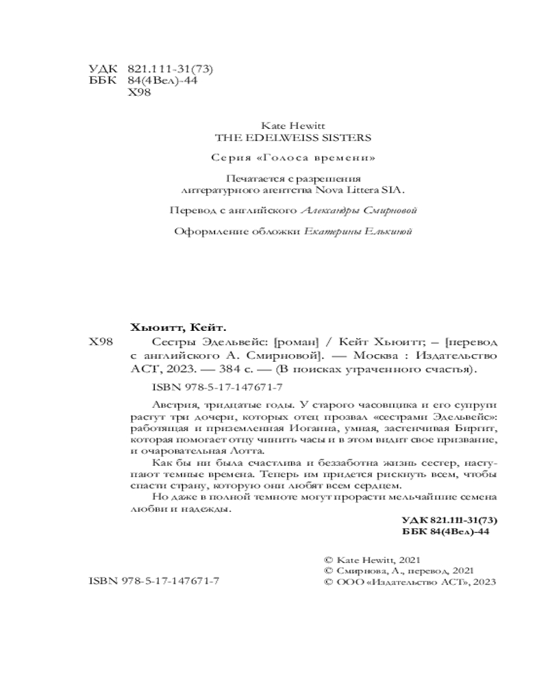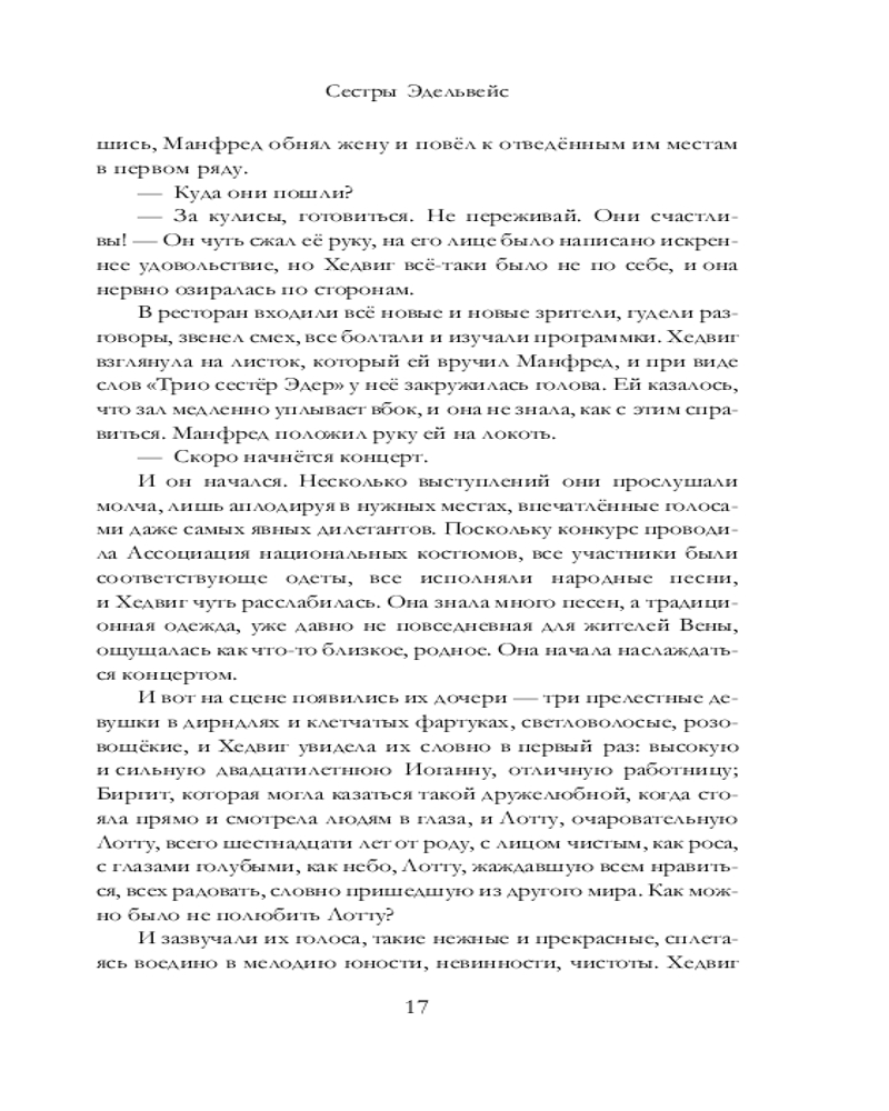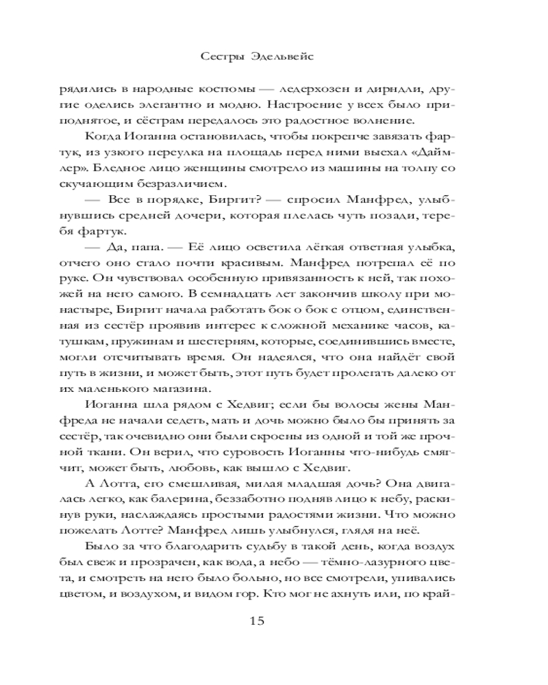💳 Оплатить за товар можно при получении 🇰🇿 Есть бесплатная доставка по Казахстану от 1 дня 🎁 Копите бонусы с каждой покупки Серия: В поисках утраченного счастья Австрия, тридцатые годы. У старого часовщика и его супруги растут три дочери, которых отец прозвал «сестрами Эдельвейс»: работящая и приземленная Иоганна, умная, застенчивая Биргит, которая помогает отцу чинить часы и в этом видит свое призвание, и очаровательная Лотта. |