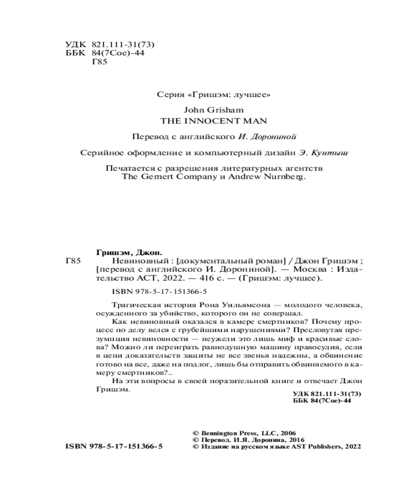 💳 Оплатить за товар можно при получении 🇰🇿 Есть бесплатная доставка по Казахстану от 1 дня 🎁 Копите бонусы с каждой покупки Серия: Гришэм: лучшее Трагическая история Рона Уильямсона — молодого человека, осужденного за убийство, которого он не совершал. |