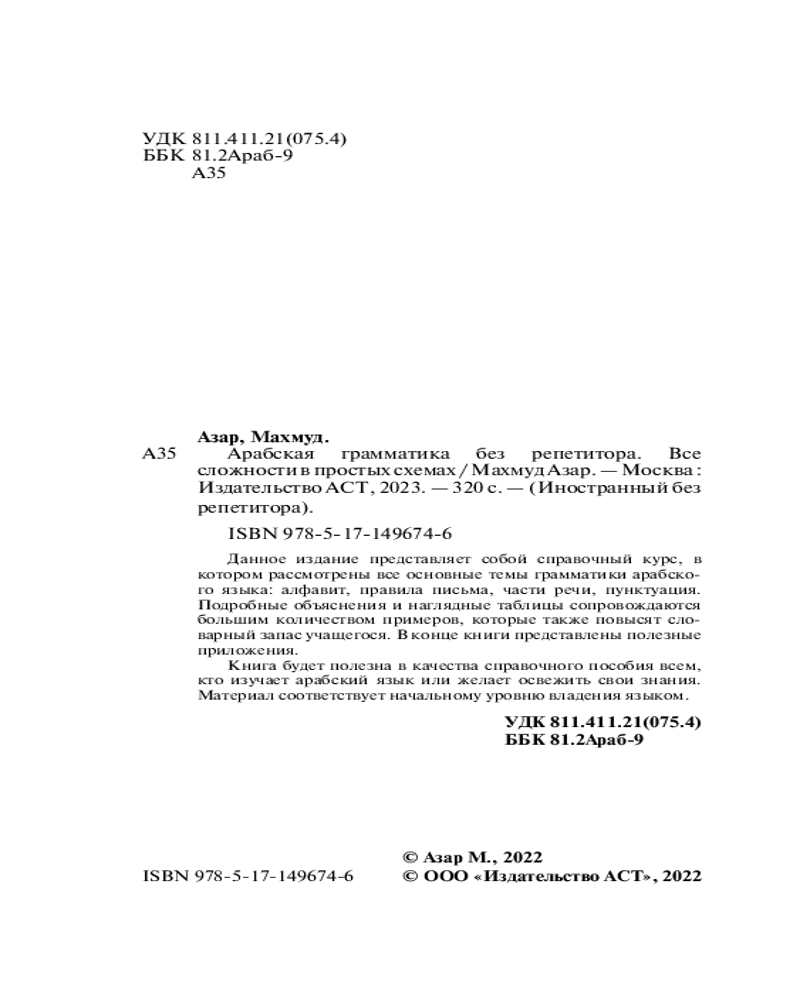 💳 Оплатить за товар можно при получении 🇰🇿 Есть бесплатная доставка по Казахстану от 1 дня 🎁 Копите бонусы с каждой покупки Серия: Иностранный без репетитора Данное издание представляет собой справочный курс, в котором рассмотрены все основные темы грамматики арабского языка: алфавит, правила письма, части речи, пунктуация. Подробные объяснения и наглядные таблицы сопровождаются большим количеством примеров, которые также повысят словарный запас учащегося. В конце книги представлены полезные приложения. |