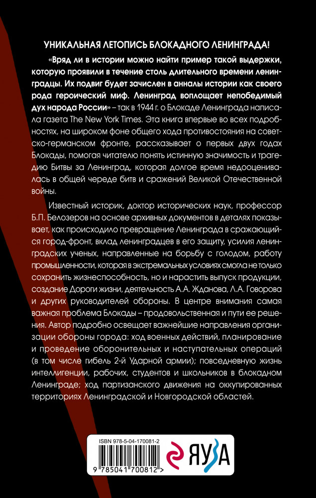Известный историк, доктор исторических наук, профессор Б.П. Белозёров на основе архивных документов в деталях показывает, как происходило превращение Ленинграда в сражающийся город-фронт, вклад ленинградцев в его защиту, усилия ленинградских ученых, направленные на борьбу с голодом, работу промышленности, которая в экстремальных условиях смогла не только сохранить жизнеспособность, но и нарастить выпуск продукции, создание Дороги жизни, деятельность А.А. Жданова, Л.А. Говорова и других руководителей обороны. В центре внимания самая важная проблема Блокады — продовольственная, и пути ее решения. Автор подробно освещает важнейшие направления организации обороны города: ход военных действий, планирование и проведение оборонительных и наступательных операций (в том числе — гибель 2-й Ударной армии); повседневная жизнь интеллигенции, рабочих, студентов и школьников в блокадном Ленинграде; ход партизанского движения на оккупированных территориях Ленинградской и Новгородской областей.