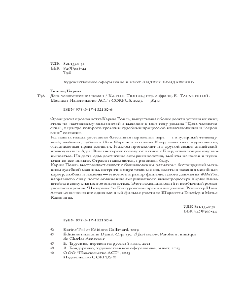 💳 Оплатить за товар можно при получении 🇰🇿 Есть бесплатная доставка по Казахстану от 1 дня 🎁 Копите бонусы с каждой покупки Серия: КИНО!! Клер Дэвис-Фарель — известная эссеистка, автор шести книг, включая бестселлер «Власть женщин», вызывающий равный восторг и у читателей, и у критиков. Ей сорок три года, у нее есть сын Александр, недавно поступивший в Стэнфордский университет, и муж Жан — семидесятилетний телеведущий, звезда экрана. Статус, достаток, успех, казалось бы, такой жизни можно только позавидовать, но все это разлетается вдребезги, когда в судьбе Клер внезапно появляется Адам — преподаватель французского языка в еврейской школе. Вспыхнувшая страсть рискует разрушить сразу несколько казавшихся образцовыми семей, вскрывает целый ворох нелицеприятных тайн, приводит к пугающим последствиям и вовлекает в свой водоворот все больше и больше людей. |