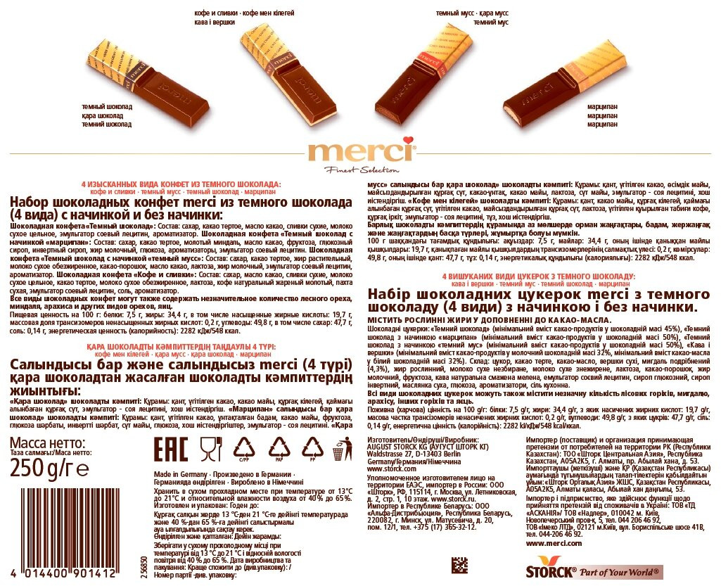 💳 Оплатить за товар можно при получении 🇰🇿 Есть бесплатная доставка по Казахстану от 1 дня 🎁 Копите бонусы с каждой покупки Серия: Finest Selection Шоколад Merci — это великолепное ассорти из уникальной коллекции изысканного шоколада, для производства которого используются ингредиенты высокого качества. Четыре изысканных вида конфет из темного шоколада, с начинкой и без неё. Изысканное ассорти из четырех видов конфет из темного шоколада европейского качества: «Кофе и сливки», «Темный мусс», «Горький шоколад», «Марцепан». |