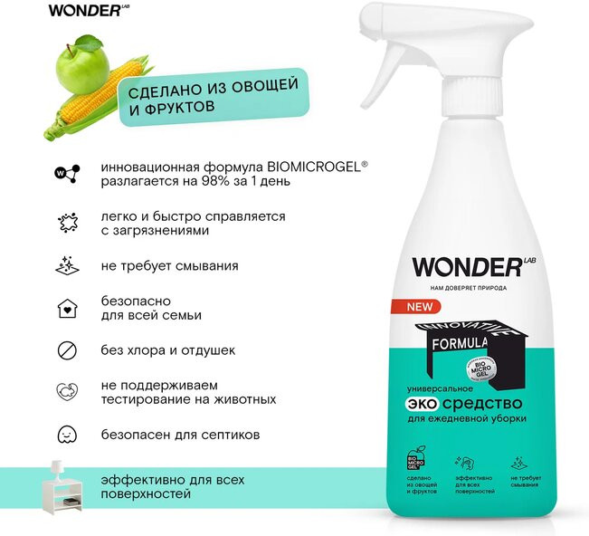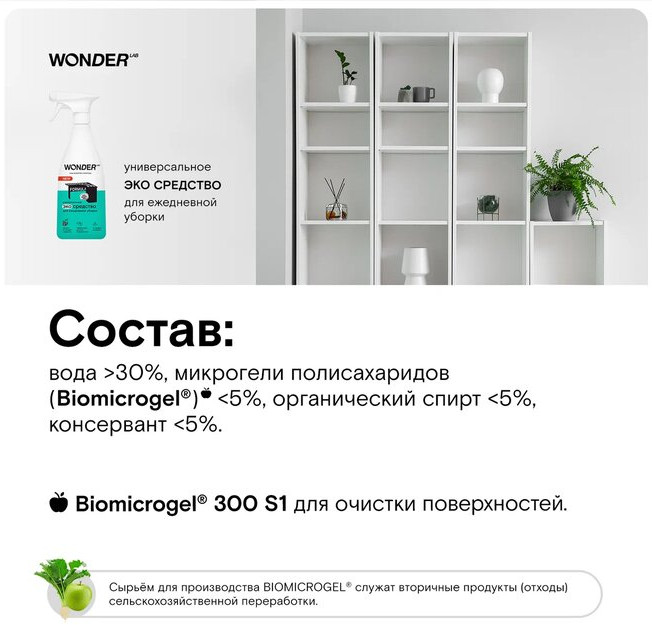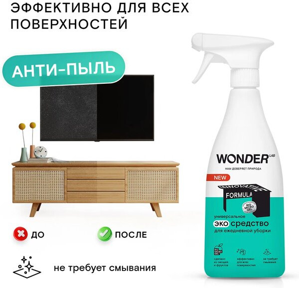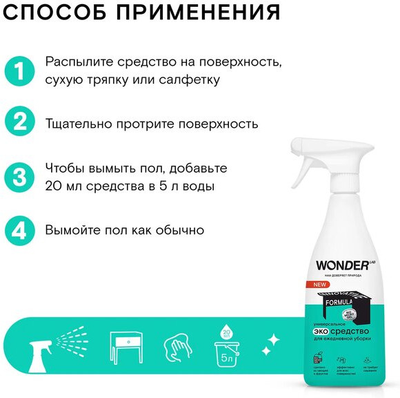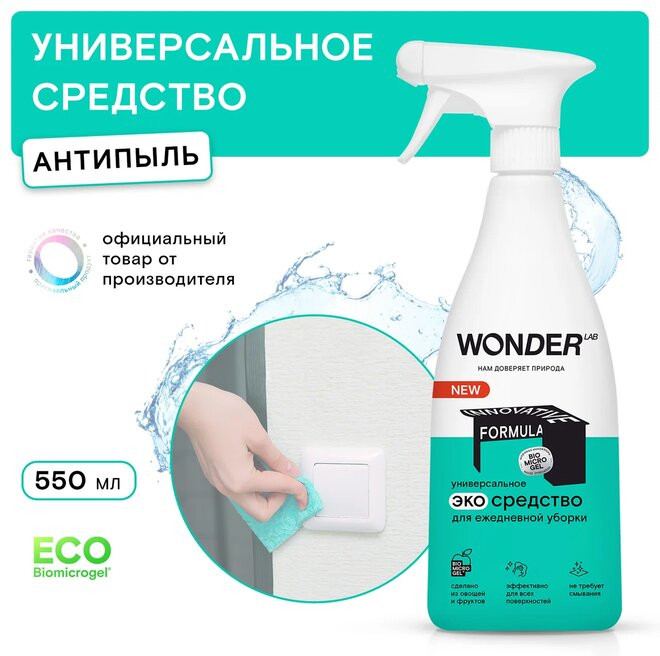 Wonder Lab Экосредство для ежедневной уборки универсальноеВ данный момент этот товар отсутствует в продаже. Возможно, у нас найдется аналогичный или похожий товар здесь. Чистящее средство для уборки дома подойдет для удаления пыли и загрязнений. Пол, двери, стены, поверхность мебели и другие глянцевые или матовые поверхности подойдут для очищения этим средством для ежедневной уборки дома. Помогает легко и бережно удалять пыль, пятна от белковых загрязнений с обоев и других поверхностей. Снимает статическое электричество и препятствует повторному осаждению пыли во время уборки. Экоспрей не содержит резкого запаха и отдушек. |