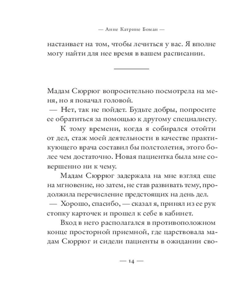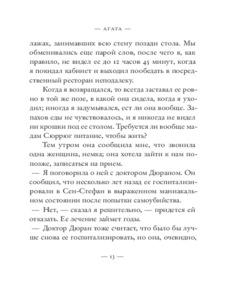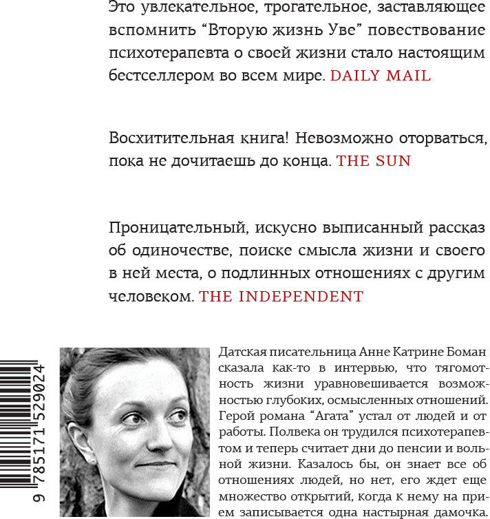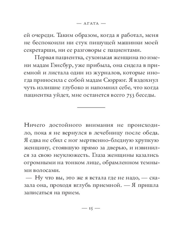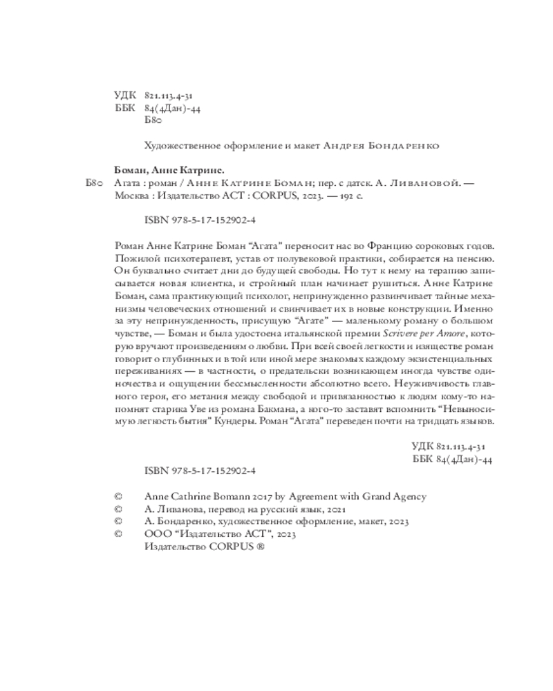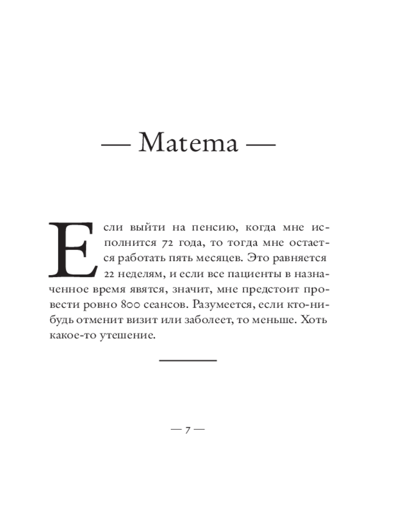 💳 Оплатить за товар можно при получении 🇰🇿 Есть бесплатная доставка по Казахстану от 1 дня 🎁 Копите бонусы с каждой покупки Серия: Corpus Франция, сороковые годы двадцатого века. Пожилой психотерапевт, уже давно потерявший всякий интерес к практике и своим пациентам, считает дни до выхода на пенсию. Ему осталось всего ничего — каких-то пять месяцев работы, иными словами, 22 недели или ровно 800 сеансов. А если повезет и кто-то отменит визит, и того меньше. Но в его расчеты внезапно вмешивается сама жизнь — в виде новой пациентки Агаты, молодой женщины с пронзительным взглядом, ярко выраженным немецким акцентом и непростой судьбой: за ее спиной — госпитализация в выраженном маниакальном состоянии после попытки самоубийства. И эта встреча внезапно становится судьбоносной для них обоих. |