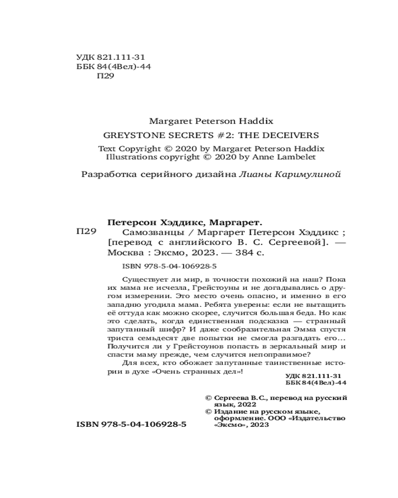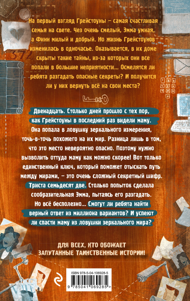 СамозванцыВ данный момент этот товар отсутствует в продаже. Возможно, у нас найдется аналогичный или похожий товар здесь. Серия: Детск. Очень странные Грейстоуны. Фэнтези для подростков Двенадцать. Столько дней Грейстоуны не видели свою маму. Она попала в ловушку зеркального измерения, точь-в-точь похожего на их мир. Это место очень опасно, и нужно вызволить маму оттуда как можно скорее. Только вот единственная подсказка, которая поможет найти путь, — это сложный запутанный шифр. И даже сообразительная Эмма пока не смогла разгадать его... Смогут ли Грейстоуны отыскать путь между мирами? И получится ли у них спасти маму? |