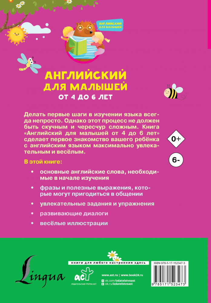 💳 Оплатить за товар можно при получении 🇰🇿 Есть бесплатная доставка по Казахстану от 1 дня 🎁 Копите бонусы с каждой покупки Серия: Английский для малышей Данное издание содержит всю необходимую базовую информацию, которая поможет вашему ребенку сделать первые уверенные шаги на пути изучения английского языка. Оно включает 40 уроков-занятий (с советами и рекомендациями), раздел с творческими заданиями на повторение и закрепление пройденного, а также прописи английских букв. |