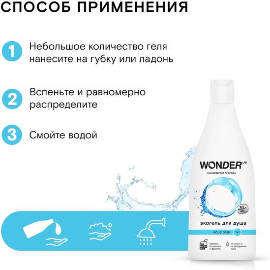 Wonder Lab Экогель для душа 2 в 1 «Aqua blue»В данный момент этот товар отсутствует в продаже. Возможно, у нас найдется аналогичный или похожий товар здесь. Гель для душа и шампунь «Aqua blue» от «Wonder Lab» бодрит и освежает как морозное утро. Гель мягко очищает кожу, подойдет и для мытья волос. Экологичное средство для мытья тела и волос гипоаллергенно. Мягко заботится о вашей коже, поддерживая pH баланс. В составе нет SLES, SLS, силиконов, парабенов и искусственных красителей. Гель для мытья тела и головы легко пенится, полностью смывается водой, не сушит кожу и не вызывает раздражения. Подходит для всех типов кожи и ежедневного использования. Благодаря универсальному аромату, гель для душа подходит и для женщин, и для мужчин. |