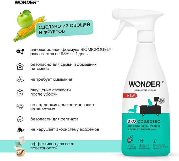 Wonder Lab Экосредство для ежедневной уборки в домах с животнымиВ данный момент этот товар отсутствует в продаже. Возможно, у нас найдется аналогичный или похожий товар здесь. Универсальное чистящее средство для уборки домов с животными. Подойдет для любых типов поверхностей в доме. Спрей удалит пыль и загрязнения после животного. Удаляет отпечатки от носа животного, следы от лап, остатки засохшей пищи возле миски на полу и других поверхностях, мусор и шерсть около подстилки любимого питомца или брызги вокруг лотка. Эффективно справляется со следами от комкующегося наполнителя. Снимает статическое электричество. Подходит для мытья пола, дверей, очистки мебели, глянцевых поверхностей и других покрытий. |