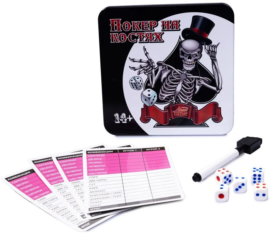 💳 Оплатить за товар можно при получении 🇰🇿 Есть бесплатная доставка по Казахстану 🎁 Копите бонусы с каждой покупки Покер на костях — это разновидность карточной игры, где вместо карт используют «кости» или игральные кубики. Цель игры — набрать как можно больше очков. Очки записываются в специальные карточки стирающимся маркером на водной основе. Это отличная игра для большой компании. |