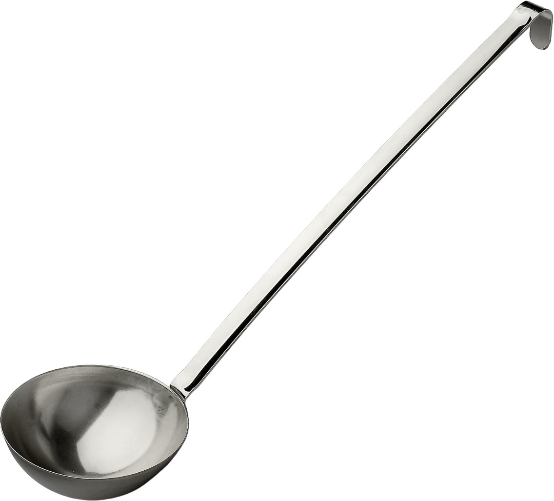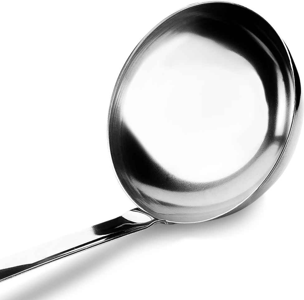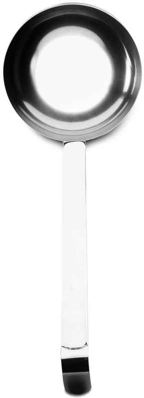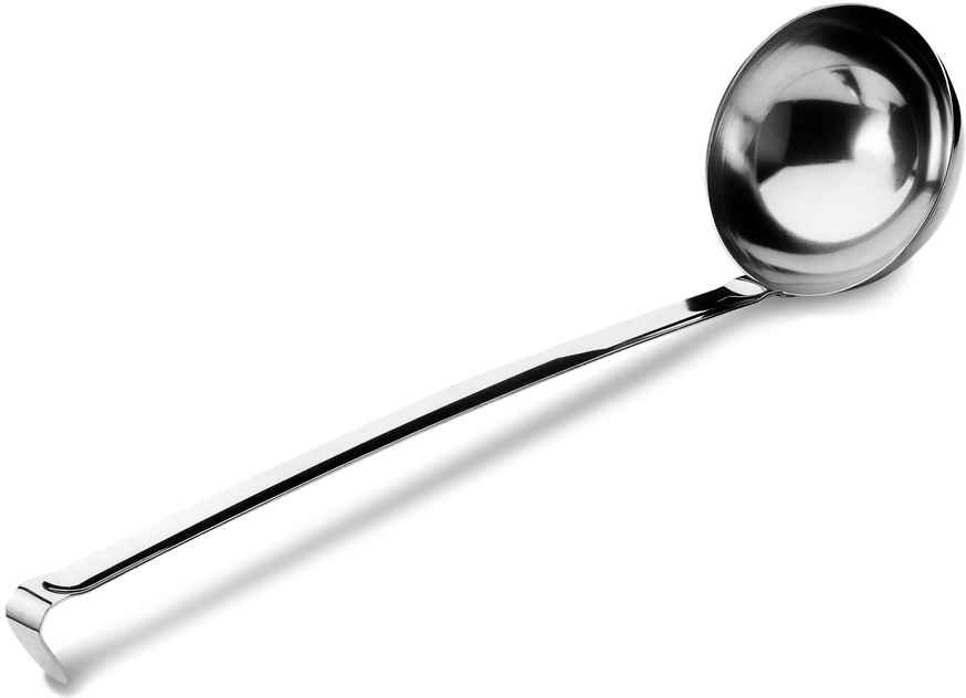 Железный черпак изготовлен полностью из пищевого нержавеющего металла. Стальная поварешка длинная, черпать из глубокой кастрюли, супницы очень удобно. Данный разливательный аксессуар из металла без носика. Не использовать с посудой, имеющей антипригарное покрытие.