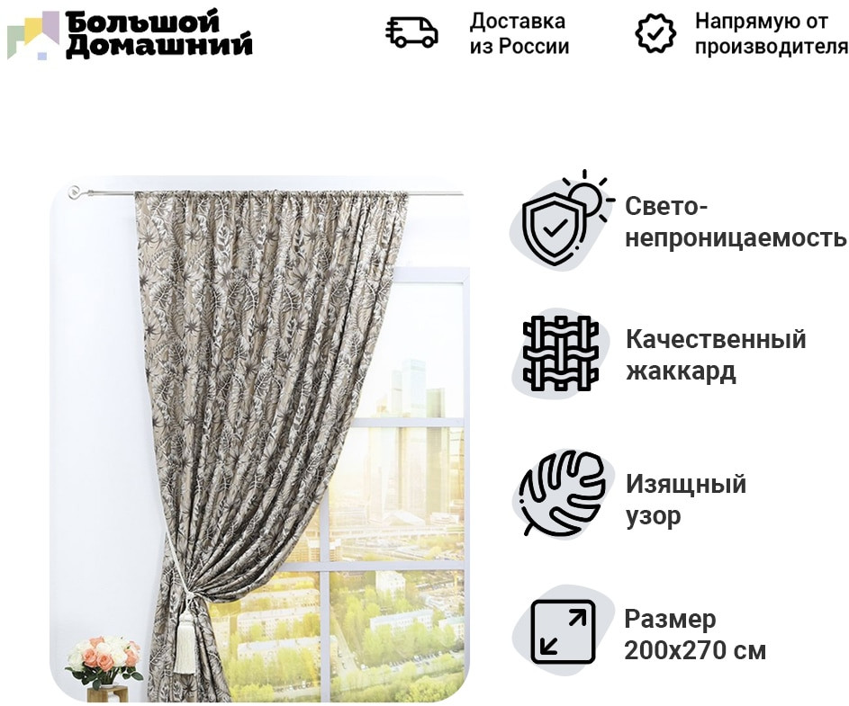 Портьера Amore Mio изготовлена из высокоплотной жаккардовой ткани с модным изображением тропического лиственного леса. Ткань изготовлена в Турции, идеально подобраны оттенки, отлично драпируется. Изделие на шторной ленте и готово к использованию.