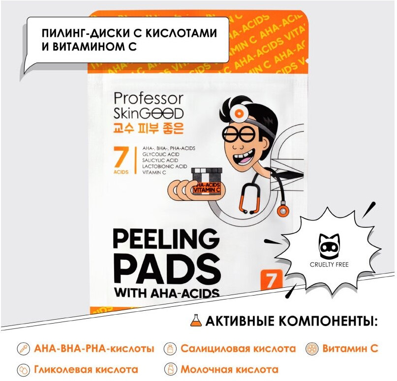 Пилинг-диски с АHA-кислотами и витамином С от Professor SkinGOOD обеспечивают деликатное обновление кожи, осветляют пигментные пятна и предупреждают развитие новых высыпаний. Комплекс AHA-BHA-PHA-кислот растворяет и отшелушивает ороговевшие, омертвевшие клетки верхнего слоя кожи. Гликолевая и молочная кислоты (фруктовые кислоты) отлично справляются с высыпаниями, воспалениями, незаменимы при угревой сыпи, предотвращают появление акне, уничтожают микробы и восстанавливают защитный барьер кожи. Фруктовые кислоты способствуют сужению пор, отбеливанию пигментных пятен и улучшают цвет и состояние лица. Салициловая кислота глубоко проникает в поры, очищая их, отшелушивает ороговевшие клетки и нормализует выработку себума (кожного сала). Витамин C или L-аскорбиновая кислота — мощный природный антиоксидант. Улучшает рельеф кожи лица, тонизирует и возвращает здоровое сияние.