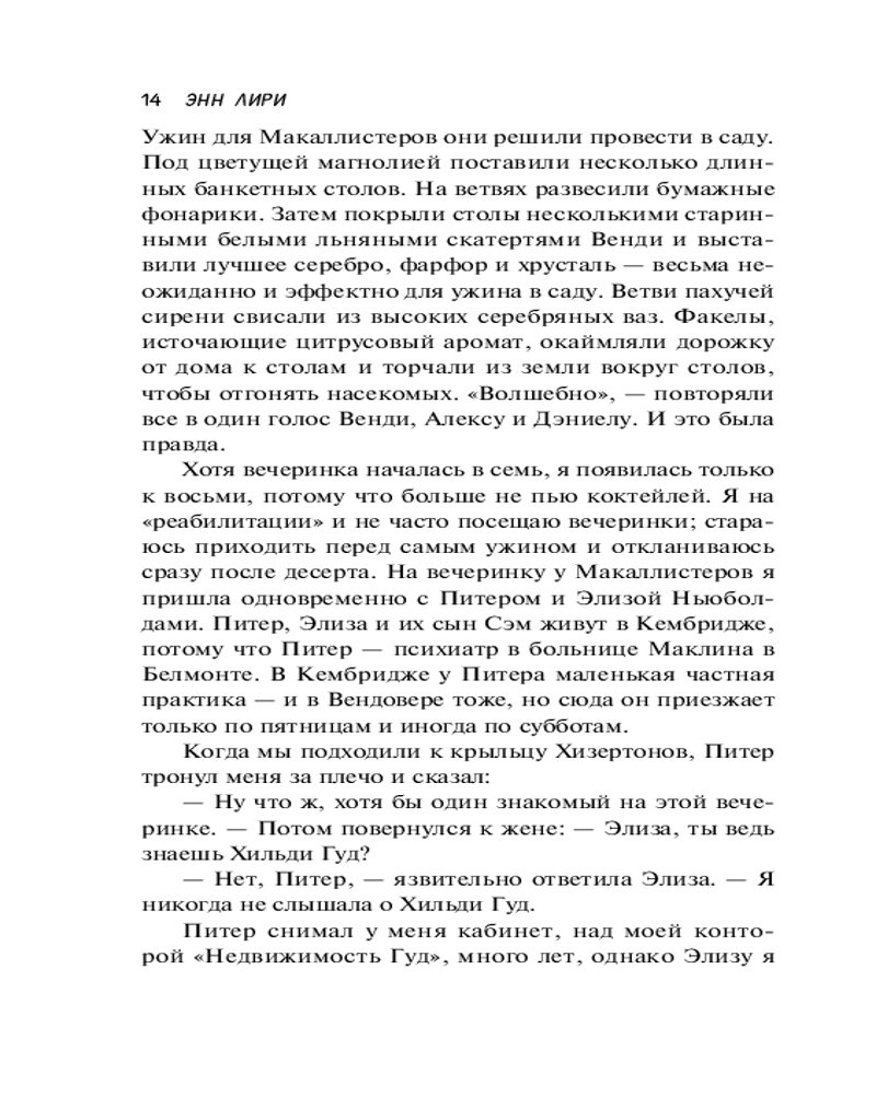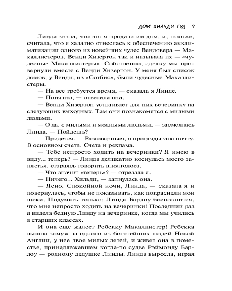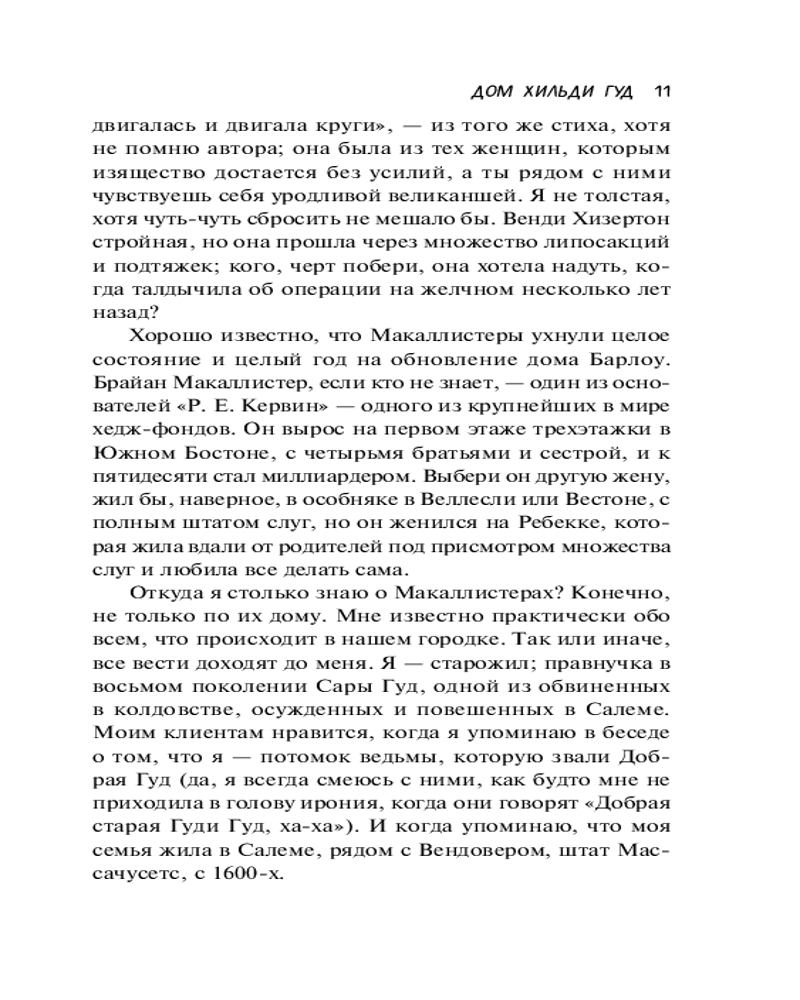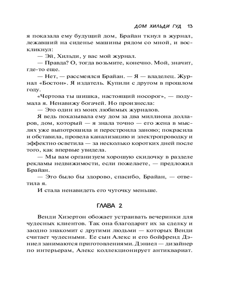 💳 Оплатить за товар можно при получении 🇰🇿 Есть бесплатная доставка по Казахстану от 1 дня 🎁 Копите бонусы с каждой покупки Серия: Хиты экрана Хильди Гуд родилась и выросла в Вендовере, живописном городе недалеко от Бостона. Ее жизнь кажется идеальной: две дочери, двухлетний внук и успешный риэлторский бизнес. А еще Хильди знает все о своих соседях, и не потому, что она праправнучка одной из ведьм, осужденных и повешенных в Салеме, просто она хорошо разбирается в людях. Вот только мало кто знает правду о ней самой. Но Хильди не из тех, кто жалеет себя. Она смотрит на мир с ухмылкой, мрачным остроумием и парочкой бокалов «пино нуар». Каждый дом рассказывает историю своего владельца, раскрывая тайны одного маленького городка... |
