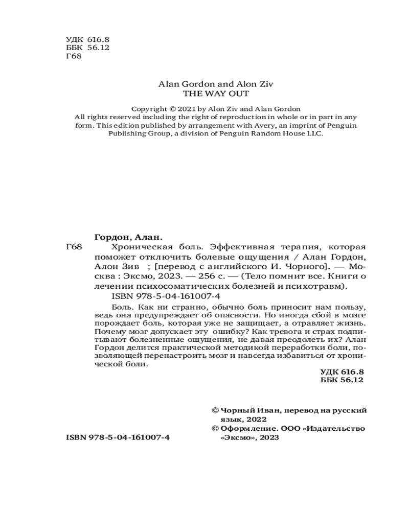 💳 Оплатить за товар можно при получении 🇰🇿 Есть бесплатная доставка по Казахстану от 1 дня 🎁 Копите бонусы с каждой покупки Серия: Тело помнит все. Книги о лечении психосоматических болезней и психотравм Автор книги Алан Гордон — профессиональный психотерапевт и основатель Центра психологии боли и Алан Зив — невролог. Методика подтверждена научными исследованиями и основана на современных знаниях о нейробиологии. В книге доступно объясняется механизм возникновения хронической боли, а сама терапия переработки представлена в виде практических методик. |