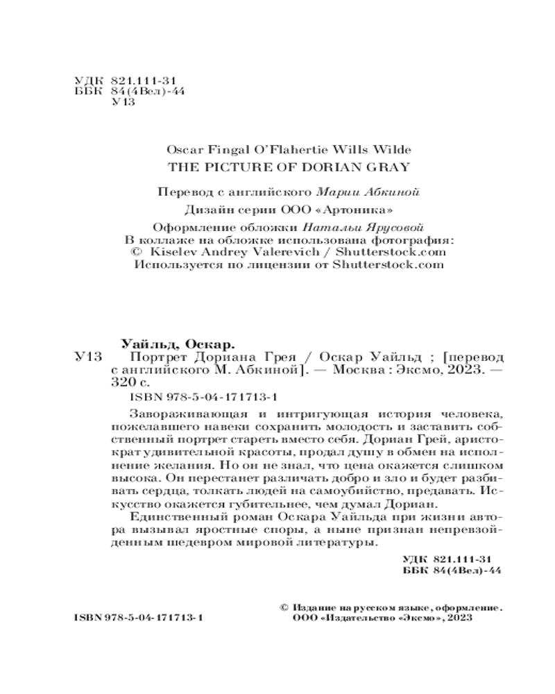 Серия: Культовая классика. Читаем главное Один из самых известных романов мировой литературы, публикация которого в 1891 году стала причиной скандала в английском обществе. Критика осудила его как аморальное произведение, однако обычными читателями роман был принят восторженно. В нем поставлены вечные вопросы человечества — о смысле жизни, об ответственности за содеянное, о величии красоты, о смысле любви и губящей власти греха. Это бессмертное произведение Оскара Уайльда экранизировалось более 25 раз. |