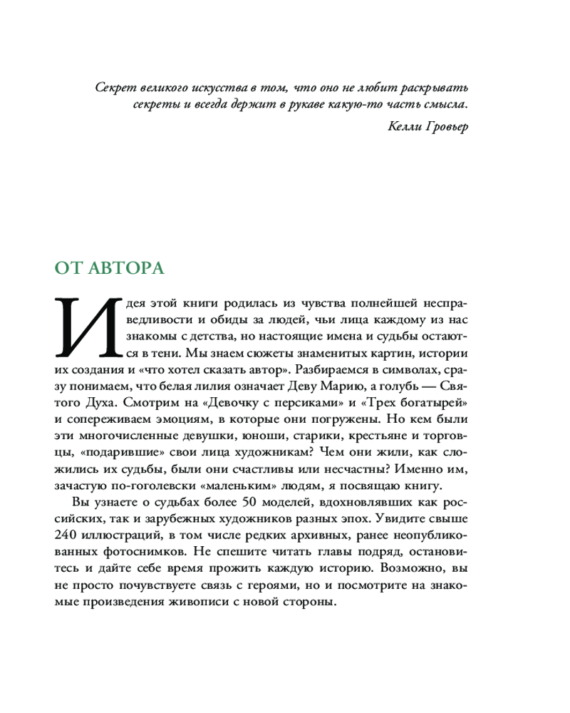 Книга добротно издана, бумага белая матовая, не бликует. Много архивных фото, иллюстрирующих истории героев картин. Про каждого героя - 2-3 странички, в объеме инстаграмм-поста. Очень рекомендую! На подарок, в качестве мини-справочника, для расширения кругозора.