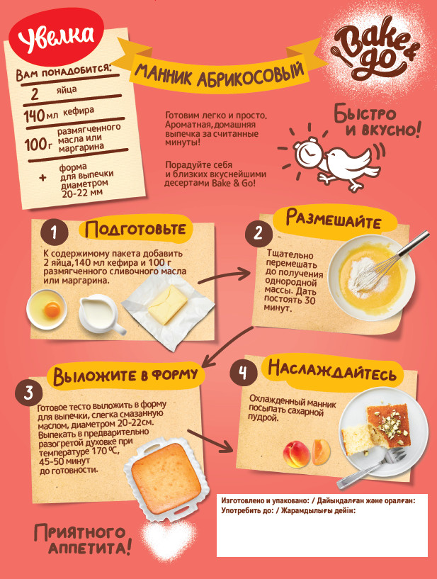 Порадуйте себя и своих близких вкуснейшими десертами Bake&Go. Ароматная домашняя выпечка готовится легко и просто за считанные минуты. Ароматный «Абрикосовый» манник Увелка не оставит равнодушным ни одного сладкоежку и поднимет настроение всем! Специально разработанный рецепт для любителей нежной выпечки!