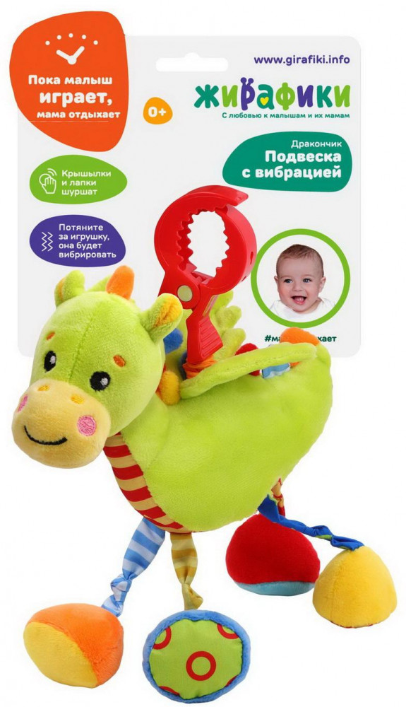 Жирафики Игрушка-подвеска «Дракончик»В данный момент этот товар отсутствует в продаже. Возможно, у нас найдется аналогичный или похожий товар здесь. Подвеска с вибрацией «Дракончик» станет одной из первых и самых любимых игрушек малыша! Красочная игрушка сделана из тканей разного цвета и разной фактуры для развития тактильных ощущений ребёнка. Благодаря удобной прищепке игрушку можно легко прикрепить к бортику детской кроватки, коляске или автокреслу. В каждой лапке и в крылышках у дракончика спрятана потайная шуршалка, которая издаёт |