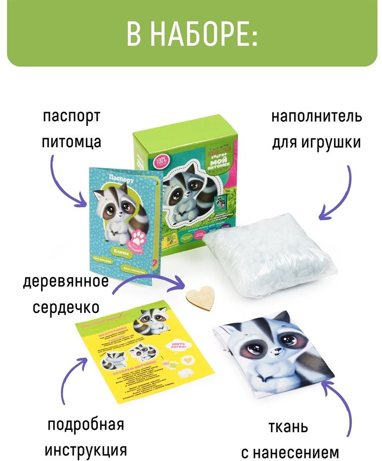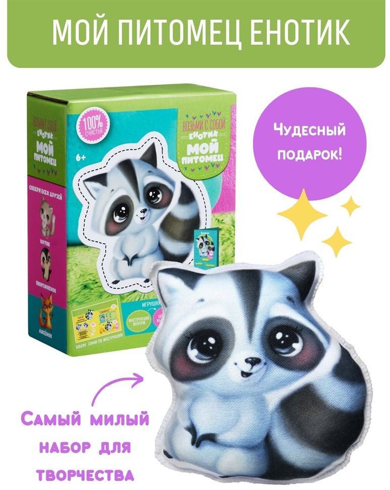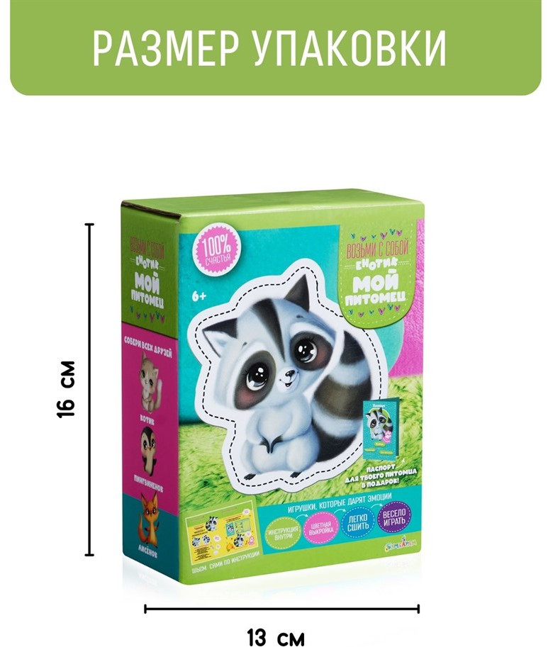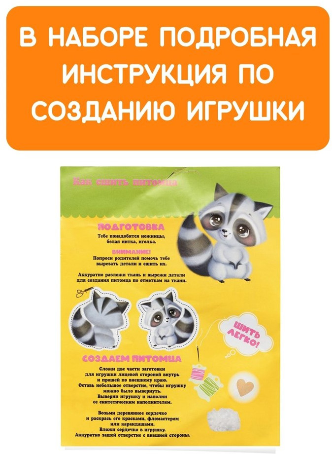 С помощью этого набора ребенок сможет самостоятельно сшить милую игрушку — любимого зверька. Этот набор понравится всем любителям енотов. В коробке есть все необходимое, понадобится только иголка и нитка. Выкройки на ткани уже выделены по контурам, их остается вырезать и сшить любым удобным способом, заполнив игрушку наполнителем. Не забудьте оживить питомца: положить внутрь деревянное сердечко. Обязательно заполните паспорт: придумайте питомцу имя и опишите, что он любит и где живет. Теперь зверек станет отличным другом для ребенка!