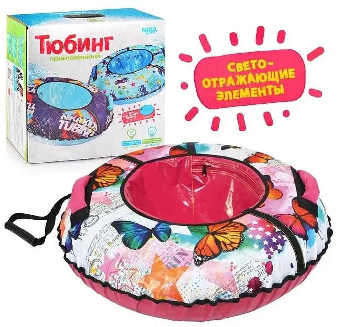 Тюбинги — это одни из главных и популярных развлечений зимой для детей и взрослых. Они дарят положительные эмоции и приятное времяпровождение. Главное их предназначение — это катания с горок и передвижение по снежному покрову. На тюбинге имеются светоотражающие элементы. Тюбинг обладает крепкими эргономичными ручками, защитным внутренним клапаном с потайной молнией и буксировочным ремнём. Все швы усилены капроновой лентой. Верх и вставки с рисунком выполнены из ткани Oxford 500D, усиленное дно представляет собой автотент ПВХ 610.