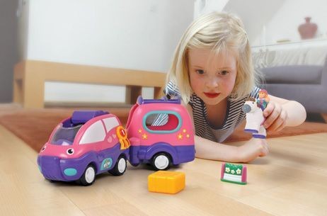 Игрушка для деток, постарше. Брала 1,6 годовалой дочке, она особо игрушкой не впечатлилась, хотя очень любит машинки. Для нее дверь откидную открывать и закрывать полностью сложновато, так же когда возит перевозчик то и дело отходит прицеп, который на магните держится. В итоге по отдельности каждую катает понемногу. Думаю, подрастет и будет уже по-другому играть с этой игрушкой. На коробке возраст указан от 1,6 до 5 лет. Исполнение игрушки понравилось.