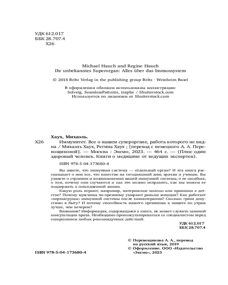 В данный момент этот товар отсутствует в продаже. Возможно, у нас найдется аналогичный или похожий товар здесь. Серия: Плюс один здоровый человек. Книги о медицине от ведущих экспертов Знаете ли вы, почему не стоит стерилизовать все вокруг? А как именно работает вакцина? Доктор медицинских наук, педиатр Михаэль Хаух и медицинский журналист Регина Хаух отвечают на эти и многие другие вопросы, касающиеся защитницы нашего организма — иммунной системы. Объясняют, почему болеть не страшно, а несколько раз в год — даже вполне нормально. А также рассказывают, как человечество сможет бороться с болезнями и помогать иммунитету уже в ближайшем будущем! |