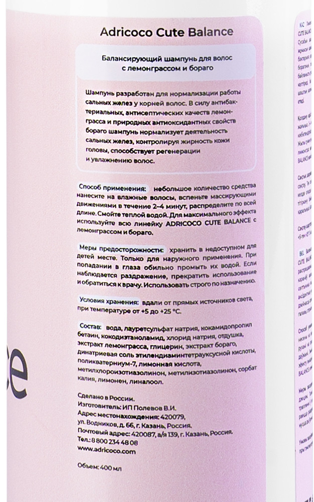 Adricoco Шампунь для волос балансирующий с лемонграссом и бораго