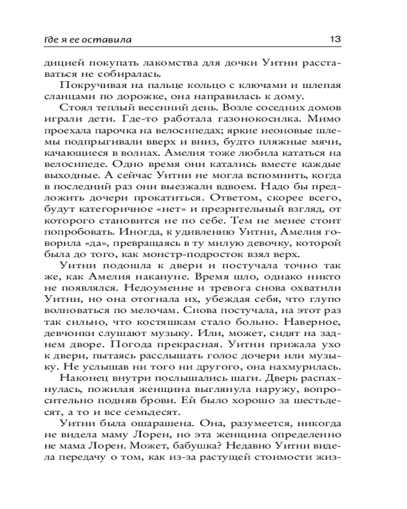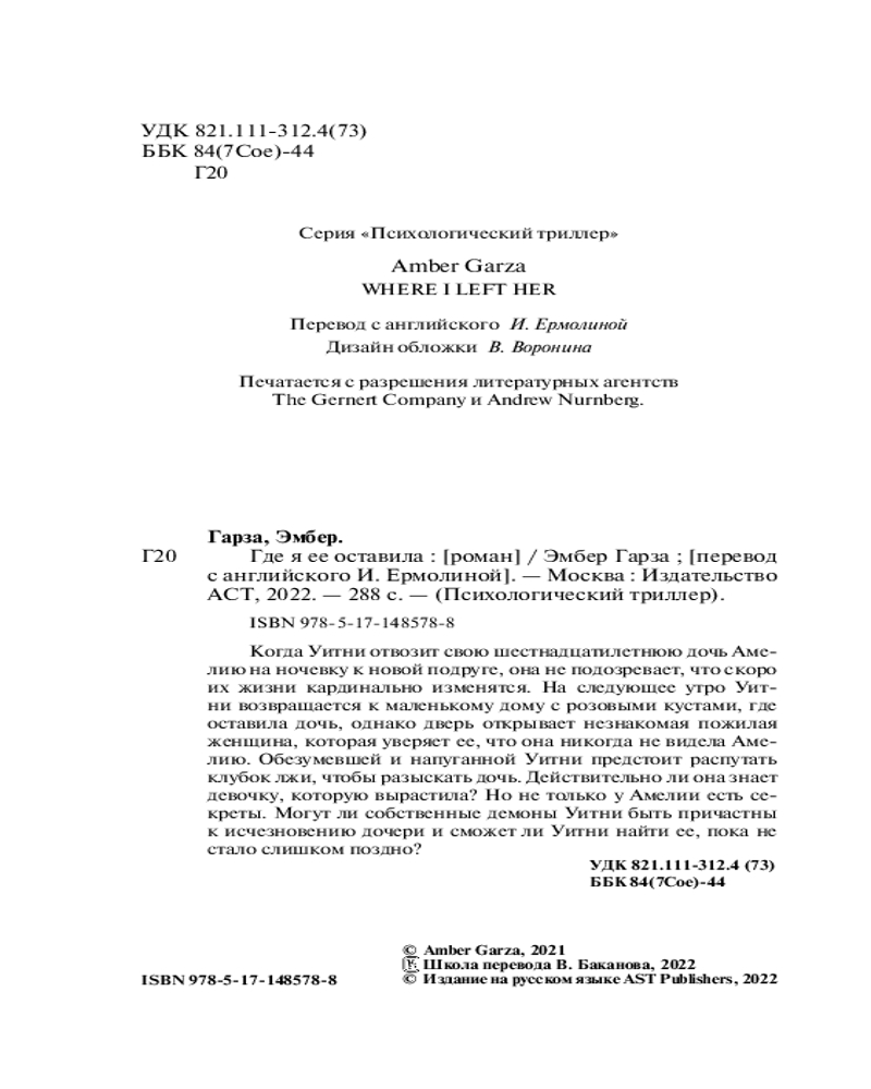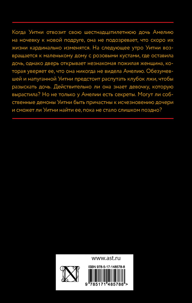 💳 Оплатить за товар можно при получении 🇰🇿 Есть бесплатная доставка по Казахстану от 1 дня 🎁 Копите бонусы с каждой покупки Серия: Психологический триллер Когда Уитни отвозит свою шестнадцатилетнюю дочь Амелию на ночевку к новой подруге, она не подозревает, что скоро их жизни кардинально изменятся. На следующее утро Уитни возвращается к маленькому дому с розовыми кустами, где оставила дочь, однако дверь открывает незнакомая пожилая женщина, которая уверяет ее, что она никогда не видела Амелию. Обезумевшей и напуганной Уитни предстоит распутать клубок лжи, чтобы разыскать дочь. Действительно ли она знает девочку, которую вырастила? Но не только у Амелии есть секреты. Могут ли собственные демоны Уитни быть причастны к исчезновению дочери и сможет ли Уитни найти ее, пока не стало слишком поздно? |