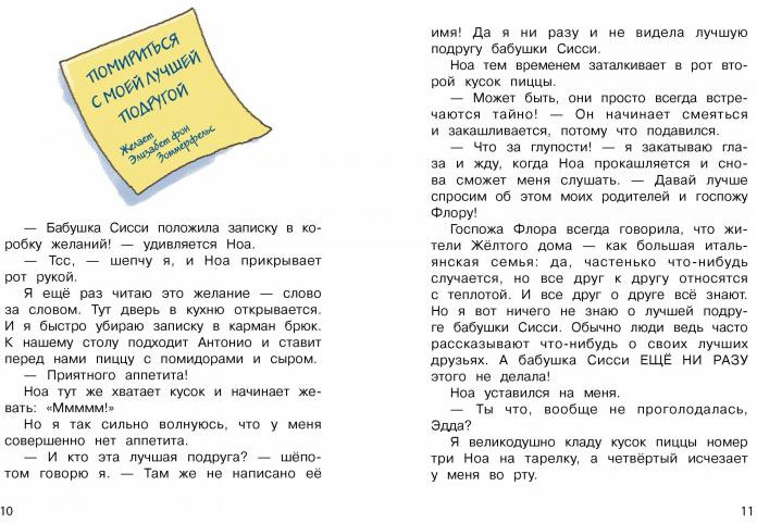 💳 Оплатить за товар можно при получении 🇰🇿 Есть бесплатная доставка по Казахстану от 1 дня 🎁 Копите бонусы с каждой покупки Серия: Детская художественная литература Вторая книга про Эдду и её необычное бюро, исполняющее заветные желания. У каждого человека есть заветное желание. И теперь Эдда и её лучший друг Ноа заботятся об исполнении этих желаний. Когда ребята нашли в волшебной коробочке записку от бабушки Сисси, они очень удивились. Неужели у бабушки Сисси есть лучшая подруга? Кто она и где её найти? И почему они не ладят? А вскоре появляется и вторая записка с заветным желанием. Да, дел у ребят невпроворот... В конце книги Эдда поделится рецептом самых вкусных на свете блинчиков с черникой. Для детей младшего школьного возраста. |