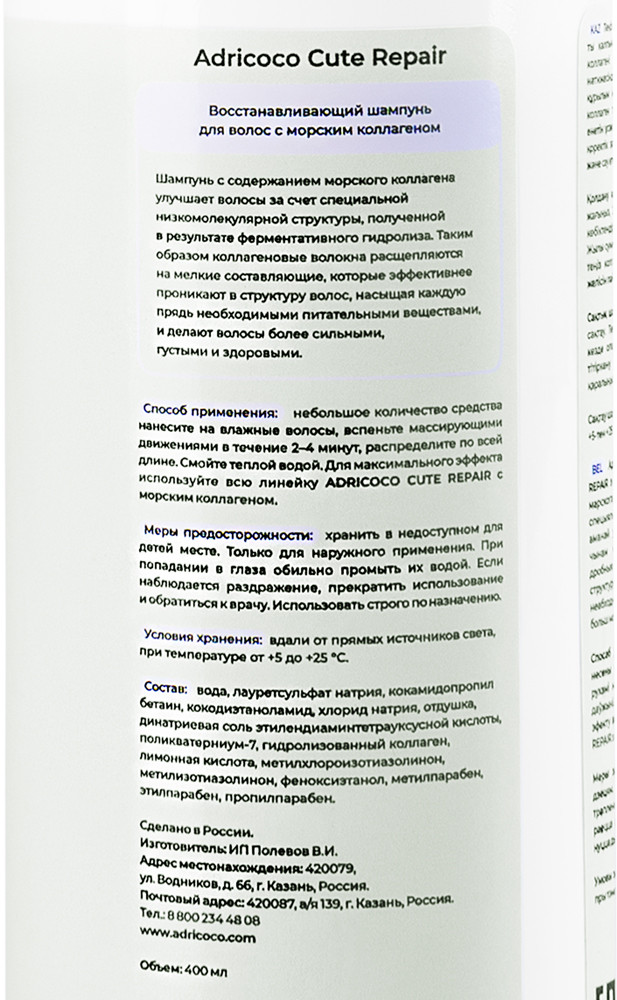 Adricoco Шампунь для волос восстанавливающий с морским коллагеном