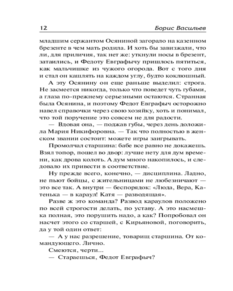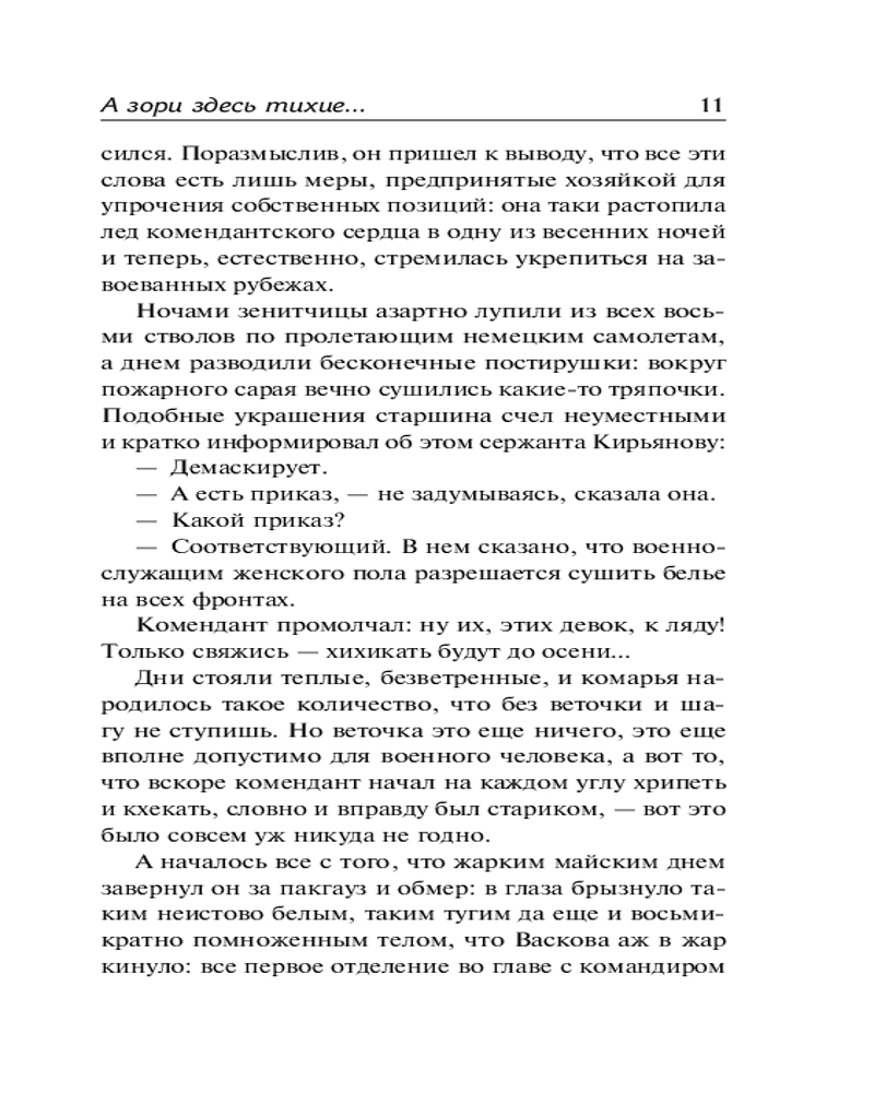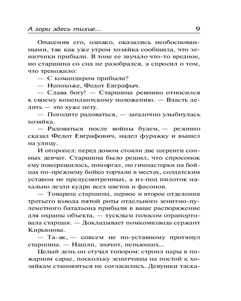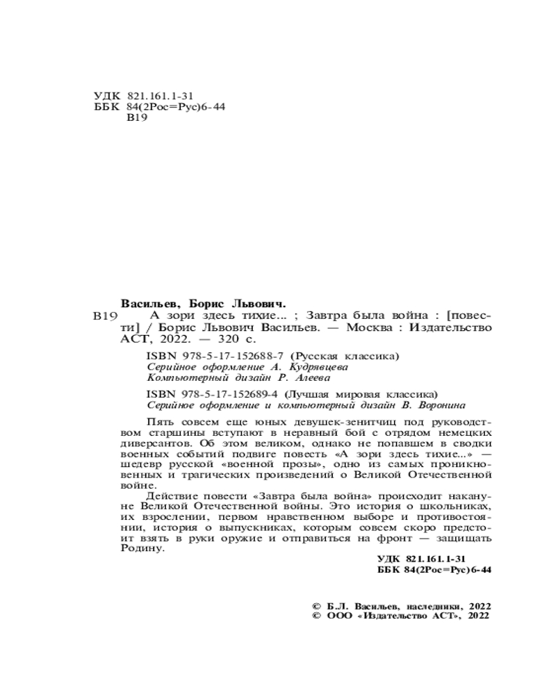💳 Оплатить за товар можно при получении 🇰🇿 Есть бесплатная доставка по Казахстану от 1 дня 🎁 Копите бонусы с каждой покупки Серия: Лучшая мировая классика Пять совсем еще юных девушек-зенитчиц под руководством старшины вступают в неравный бой с отрядом немецких диверсантов. Об этом великом, однако не попавшем в сводки военных событий подвиге повесть «А зори здесь тихие...» — шедевр русской «военной прозы», одно из самых проникновенных и трагических произведений о Великой Отечественной войне. |
