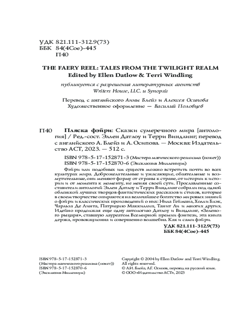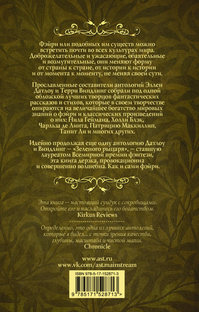Идейно продолжая еще одну антологию Датлоу и Виндлинг — «Зеленого рыцаря», — ставшую лауреатом Всемирной премии фэнтези, эта книга дерзка, провокационна и совершенно волшебна. Как и сами фэйри. |