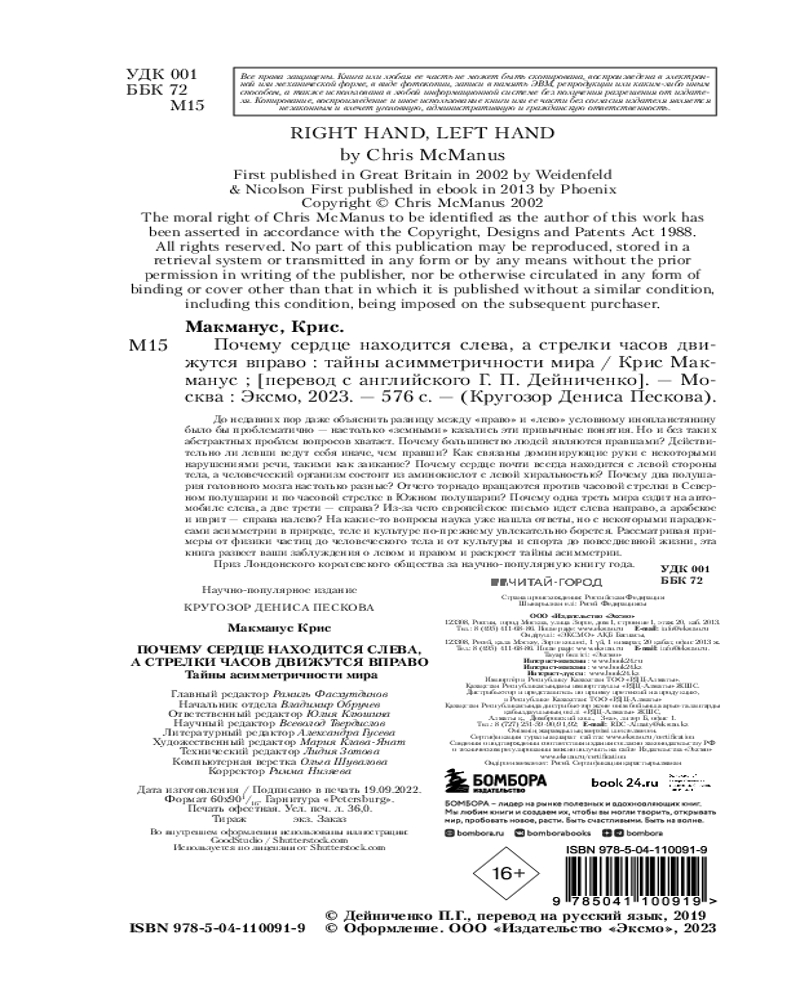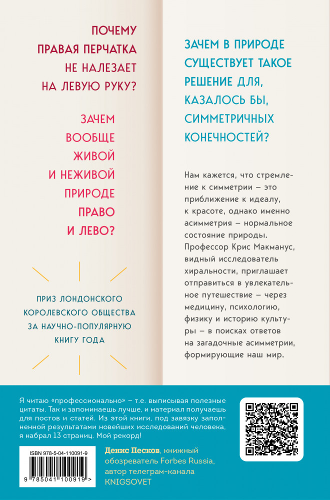 💳 Оплатить за товар можно при получении 🇰🇿 Есть бесплатная доставка по Казахстану от 1 дня 🎁 Копите бонусы с каждой покупки Серия: Кругозор Дениса Пескова Почему правая перчатка не налезает на левую руку? Зачем в природе существует такое решение для, казалось бы, симметричных конечностей? Зачем вообще живой и неживой природе право и лево? Нам кажется, что стремление к симметрии — это приближение к идеалу, к красоте, однако именно асимметрия нормальное состояние природы. Профессор Крис Макманус, видный исследователь хиральности, приглашает отправиться в увлекательное путешествие — через медицину, психологию, физику и историю культуры — в поисках ответов на загадочные асимметрии, формирующие наш мир. |