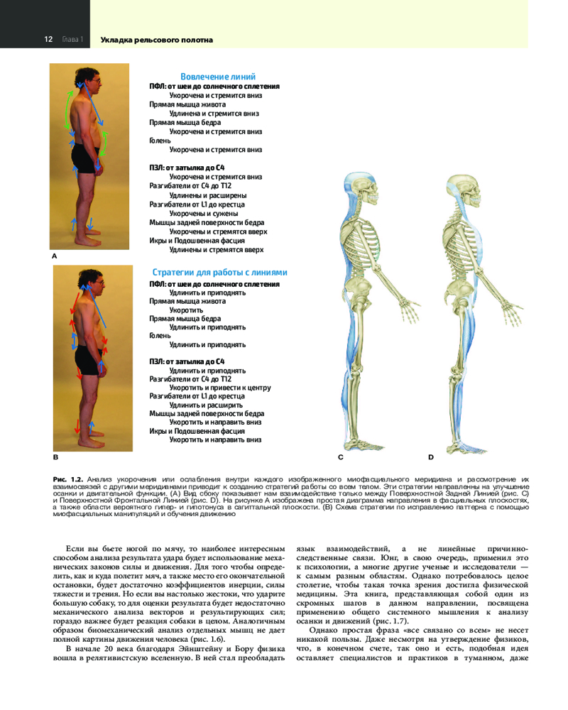 Т. Майерс предлагает революционный подход к изучению миофасциальной анатомии человека, разработав целую карту меридианов, то есть непрерывных линий в теле человека, ориентируясь на которую, можно определить истинный источник боли. В книге предложены методы оценки осанки («чтение тела»), подробно описаны неправильные паттерны движения, встречающиеся в практике терапевта, а также даны рекомендации по корректировке. Каждый раздел сопровождается большим объемом фотографий, многие из которых были сделаны специально для 4-го издания.