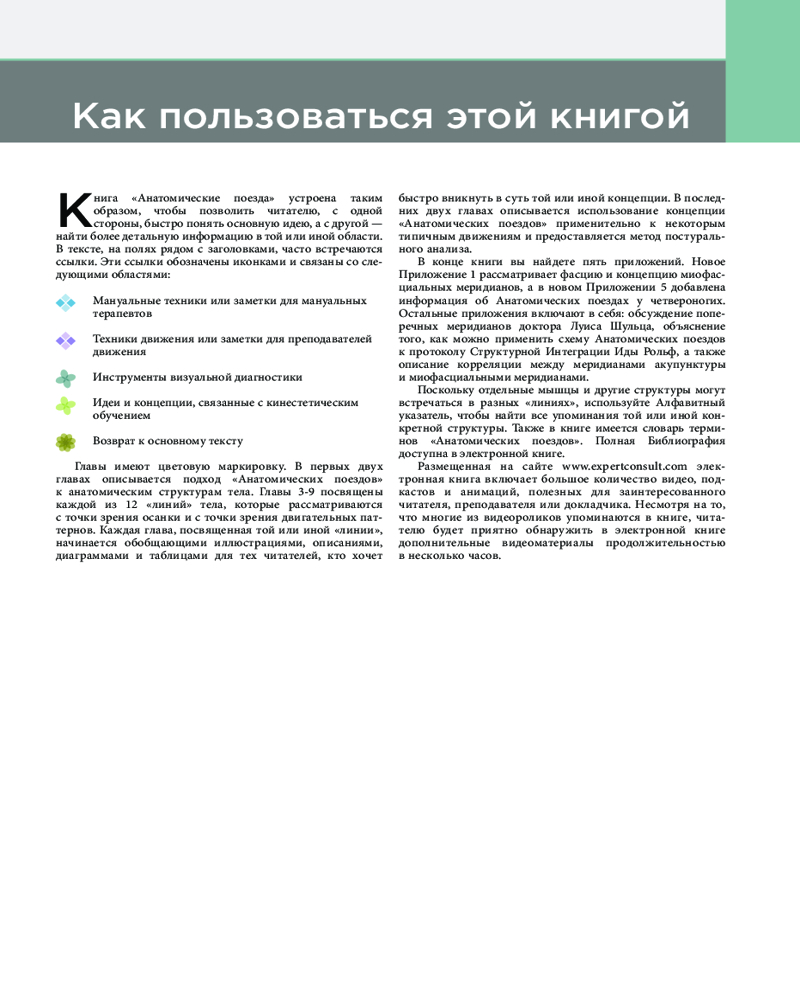— контент полностью обновлен в соответствии с данными последних исследований и включает в себя новое освещение идеи Анатомических поездов в движении с учетом данных об элементах, свойствах, неврологии и происхождении фасциальной системы;