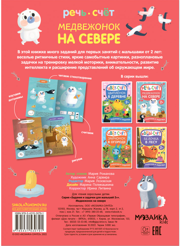 💳 Оплатить за товар можно при получении 🇰🇿 Есть бесплатная доставка по Казахстану 🎁 Копите бонусы с каждой покупки Серия: Задания и задачки для малышей 2+ В книжке «Медвежонок на Севере» серии «Задания и задачки для малышей 2+» ребенок отправится в путешествие на холодный Север, познакомится с его обитателями, научится различать противоположности, дорисует картинки, а также потренирует навык счета, логику и воображение. А в конце книжки его ждет запутанный лабиринт! |