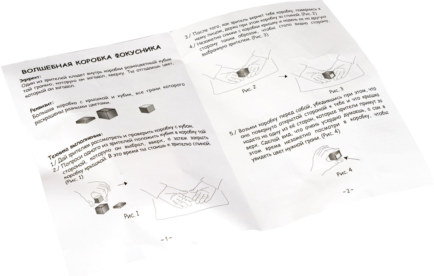 Суть фокуса: Один из зрителей кладет внутрь коробки разноцветный кубик той гранью, которую он загадал, кверху. Ты отгадаешь цвет, который он загадал.