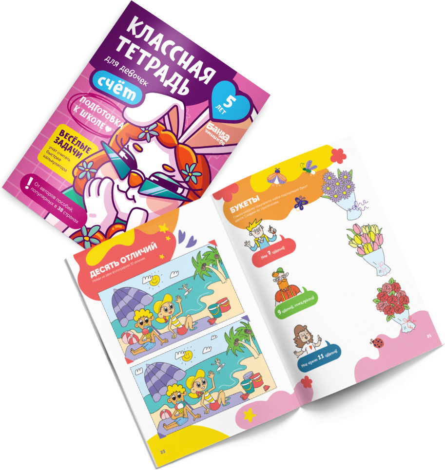 «Классная тетрадь. Счет для девочек 5 лет» предназначена для знакомства с цифрами и основами математики. Дети будут тренироваться в начертании цифр и формировать навыки счета. Все задания в «Классных тетрадях» сделаны так, чтобы дети учились считать легко и быстро. Ребенок знакомится с математическими понятиями с помощью наглядных примеров из реальной жизни. Например, девочкам будет интереснее считать, сколько цветов в букете. Внутри тетрадей яркие иллюстрации и дружелюбные персонажи, которые помогут выполнить любое задание на сложение или вычитание легко и весело.