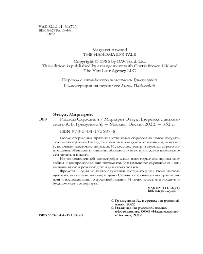 В данный момент этот товар отсутствует в продаже. Возможно, у нас найдется аналогичный или похожий товар здесь. Серия: Young Adult. Легендарные книги «Рассказ Служанки» — знаменитый антиутопический роман Маргарет Этвуд, неоднократно переиздававшийся и переведенный на многие языки, стоит в ряду с такими великими произведениями, как «1984» Дж. Оруэлла, «О дивный новый мир» О. Хаксли и «451° по Фаренгейту» Р. Брэдбери. Убедительная панорама будущего, которое может начаться уже завтра. Книга была удостоена Премии генерал-губернатора и Премии Артура Кларка. Также была номинирована на премию «Небьюла» и Букеровскую премию и «Прометей». Роман несколько раз был экранизирован — полнометражный фильм 1990 года и телесериал 2017 года. |