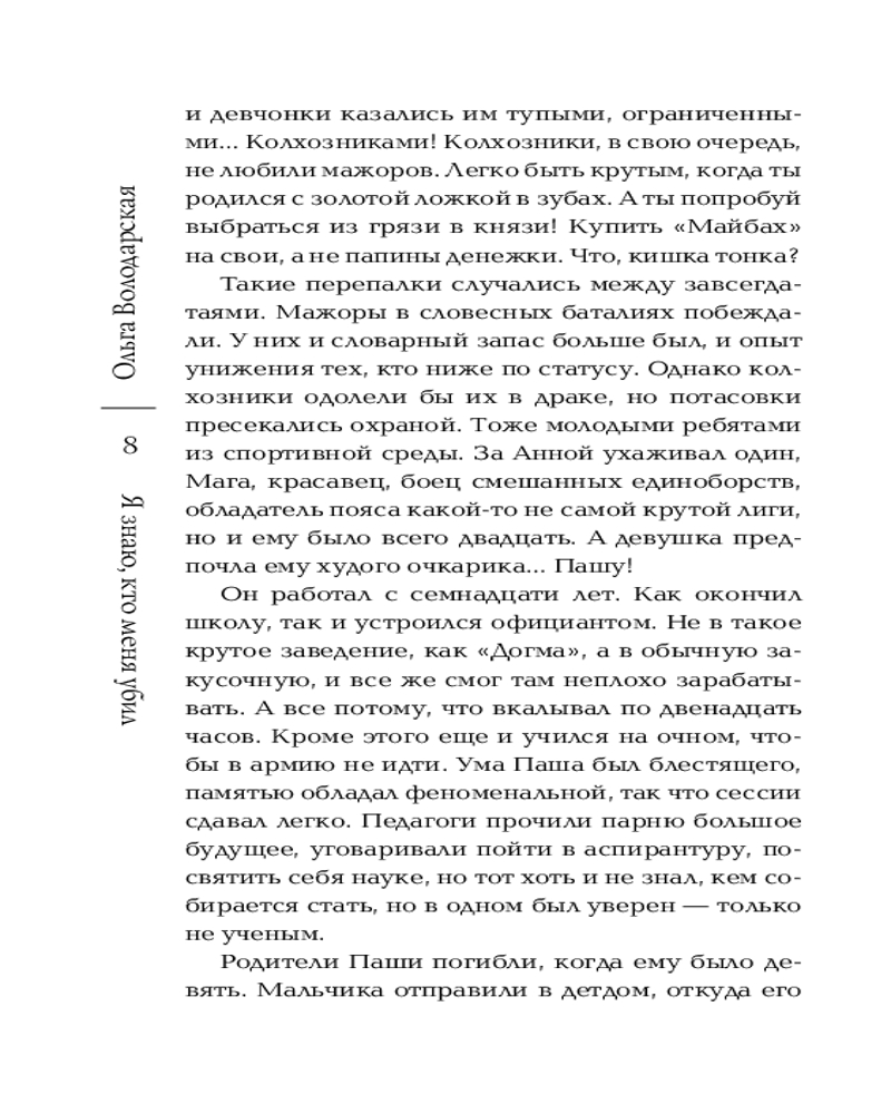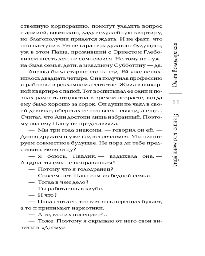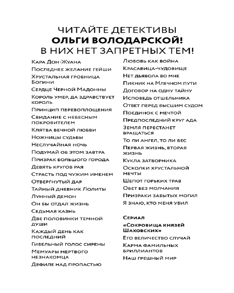 | Ольга Володарская — известный писатель, автор более чем пятидесяти книг в жанре остросюжетного романа. Детективы Ольги Володарской сочетают остроту современной прозы и напряженность психологического триллера. |