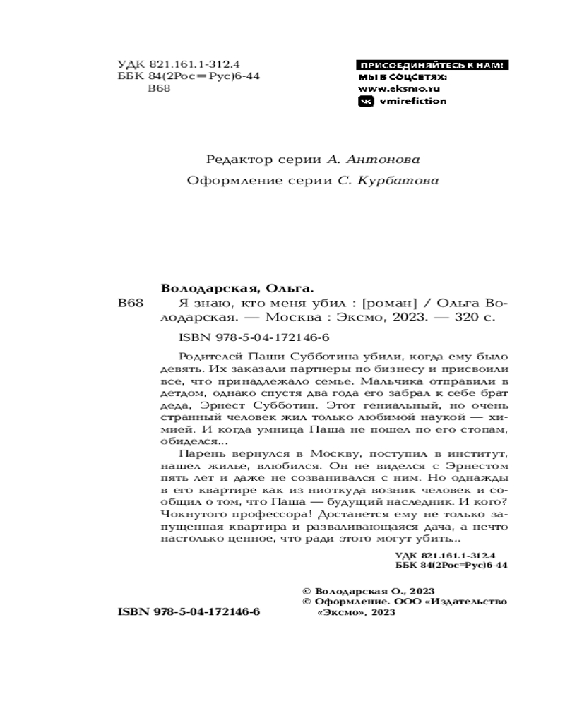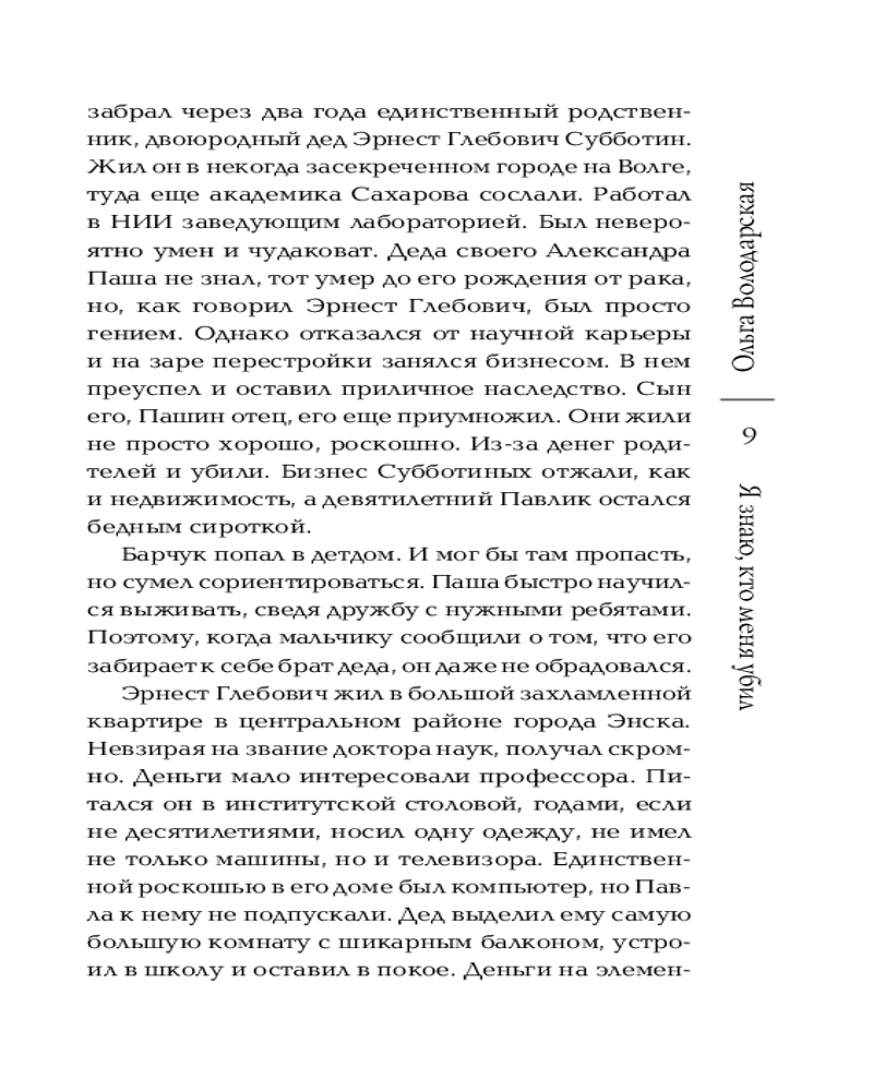 💳 Оплатить за товар можно при получении 🇰🇿 Есть бесплатная доставка по Казахстану от 1 дня 🎁 Копите бонусы с каждой покупки Серия: Никаких запретных тем! Остросюжетная проза О. Володарской. Новое оформление (обложка) Родителей Паши Субботина убили, когда ему было девять. Их заказали партнеры по бизнесу и присвоили все, что принадлежало семье. Мальчика отправили в детдом, однако спустя два года его забрал к себе брат деда, Эрнест Субботин. Этот гениальный, но очень странный человек жил только любимой наукой — химией. И когда умница Паша не пошёл по его стопам, обиделся... |