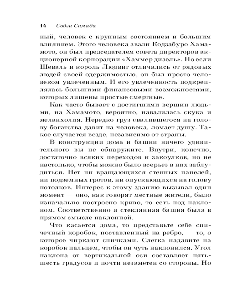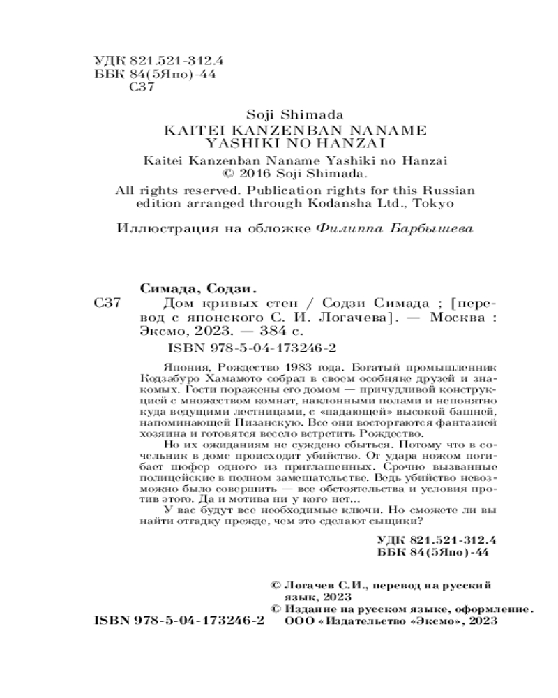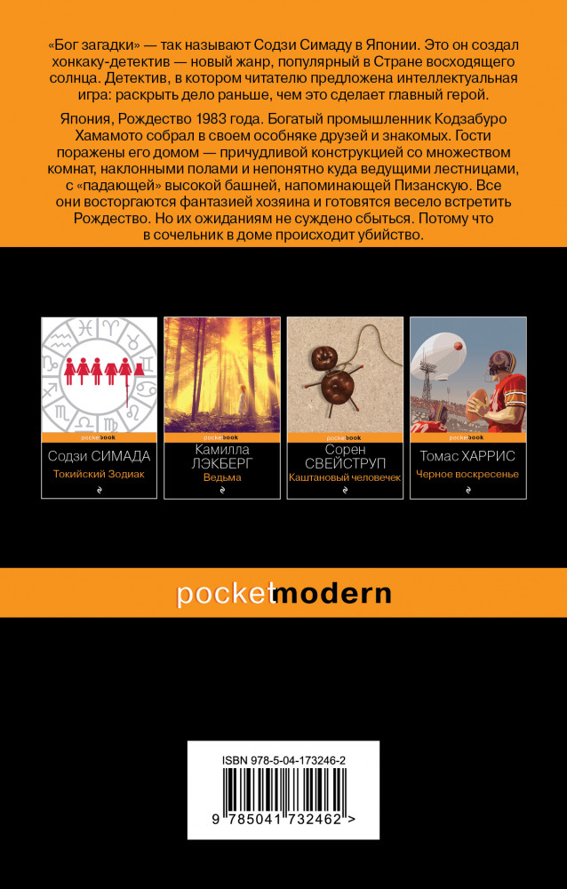 💳 Оплатить за товар можно при получении 🇰🇿 Есть бесплатная доставка по Казахстану 🎁 Копите бонусы с каждой покупки Серия: Pocket Book (обложка) Япония, Рождество 1983 года. Богатый промышленник Кодзабуро Хамамото собрал в своем особняке друзей и знакомых. Гости поражены его домом — причудливой конструкцией с множеством комнат, наклонными полами и непонятно куда ведущими лестницами, с «падающей» высокой башней, напоминающей Пизанскую. Все они восторгаются фантазией хозяина и готовятся весело встретить Рождество. |