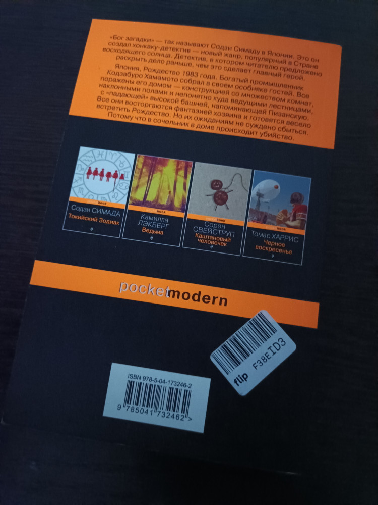 Отличный сюжет, читается легко. Конечно, сравнивать с "Токийским зодиаком" не нужно, тут другая история, даже загадочной чем в предыдущей книге. Лично мне было сложно вычислить преступника, но в некоторых местах всё таки я была права. Чтение доставило удовольствие👍🏼 P.S пожалуйста, flip, сжальтесь над книжками и не клейте штрих код посередине обложки, можно же аккуратно внизу наклеить 🙈
