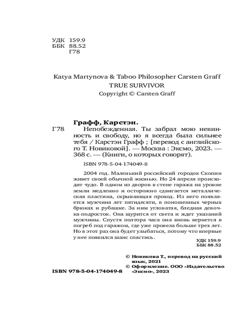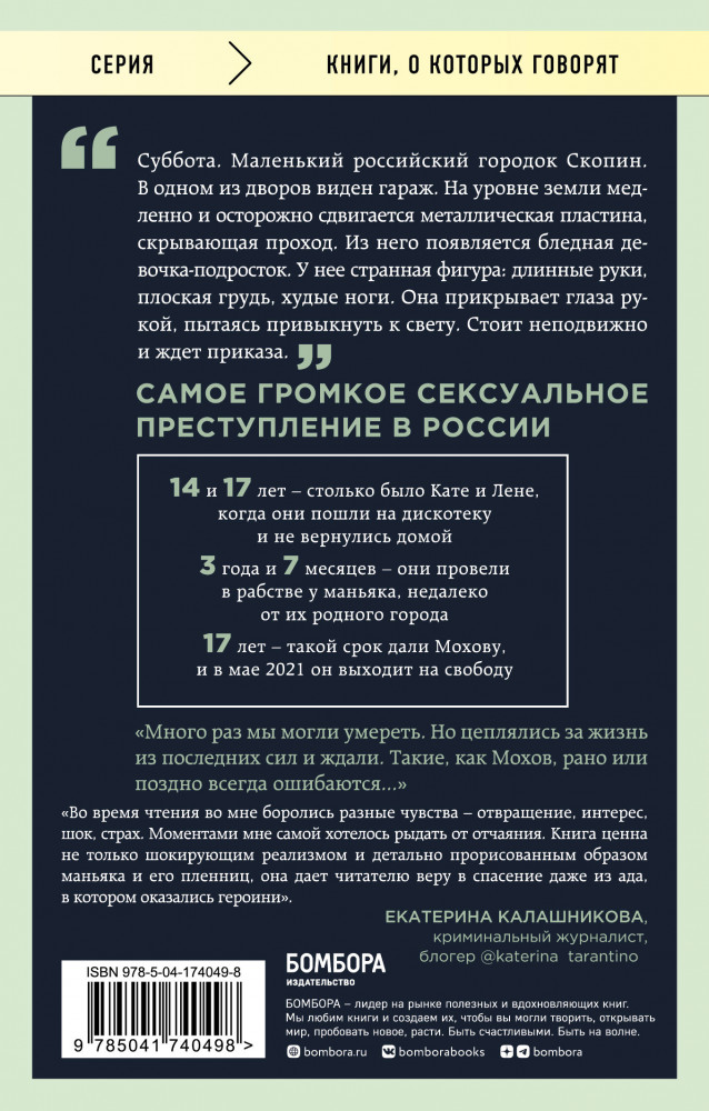 💳 Оплатить за товар можно при получении 🇰🇿 Есть бесплатная доставка по Казахстану от 1 дня 🎁 Копите бонусы с каждой покупки Серия: Книги, о которых говорят Суббота. Маленький российский городок Скопин. В одном из дворов виден гараж. На уровне земли медленно и осторожно сдвигается металлическая пластина, скрывающая проход. Из него появляется бледная девочка-подросток. У нее странная фигура: длинные руки, плоская грудь, худые ноги. Она прикрывает глаза рукой, пытаясь привыкнуть к свету. Стоит неподвижно и ждет, что ей прикажут делать. |