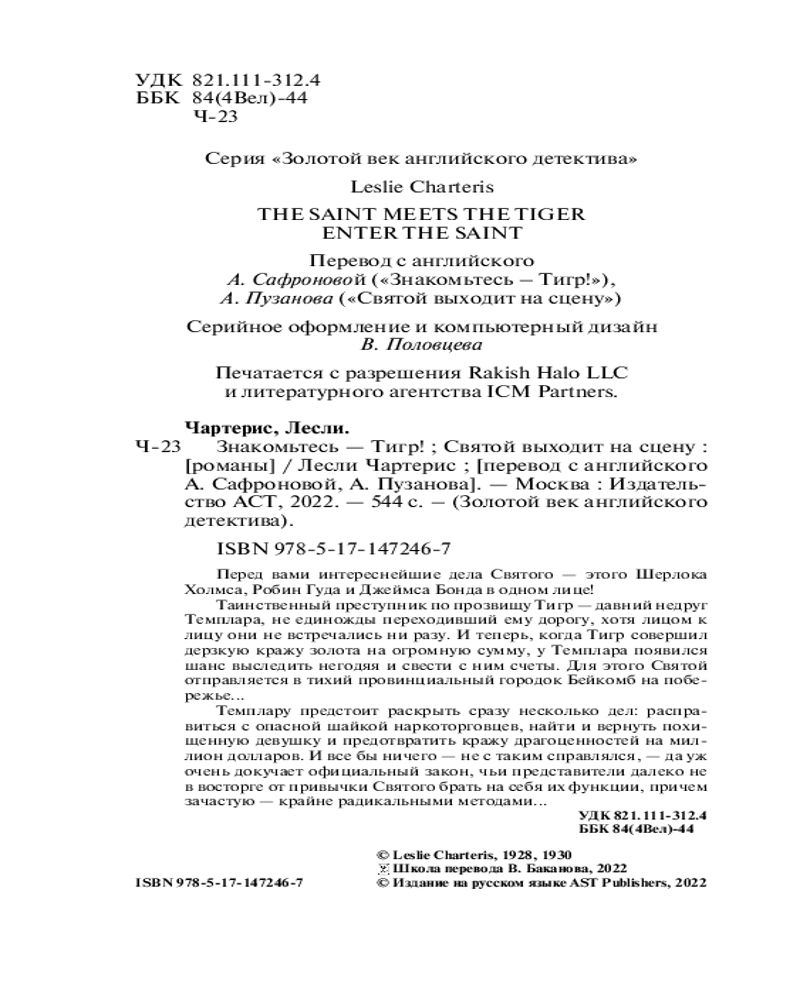 Серия: Золотой век английского детектива Перед вами интереснейшие дела Святого — этого Шерлока Холмса, Робина Гуда и Джеймса Бонда в одном лице! Таинственный преступник по прозвищу Тигр — давний недруг Темплара, не единожды переходивший ему дорогу, хотя лицом к лицу они не встречались ни разу. И теперь, когда Тигр совершил дерзкую кражу золота на огромную сумму, у Темплара появился шанс выследить негодяя и свести с ним счеты. Для этого Святой отправляется в тихий провинциальный городок Бейкомб на побережье... |