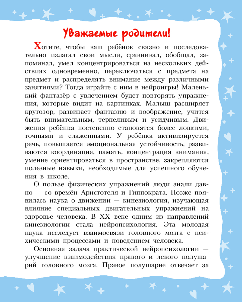 💳 Оплатить за товар можно при получении 🇰🇿 Есть бесплатная доставка по Казахстану от 1 дня 🎁 Копите бонусы с каждой покупки Серия: Легкое обучение: все просто и наглядно Хотите, чтобы ваш ребёнок связно и последовательно излагал свои мысли, умел концентрироваться и выполнять несколько действий одновременно? Тогда играйте с ним в нейроигры! |