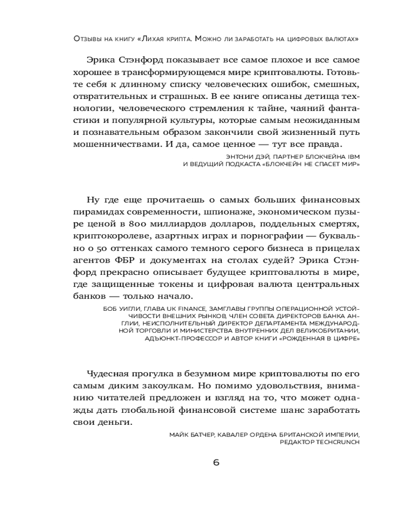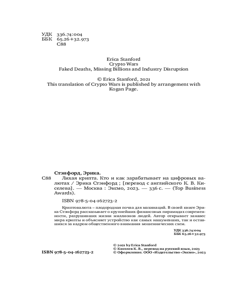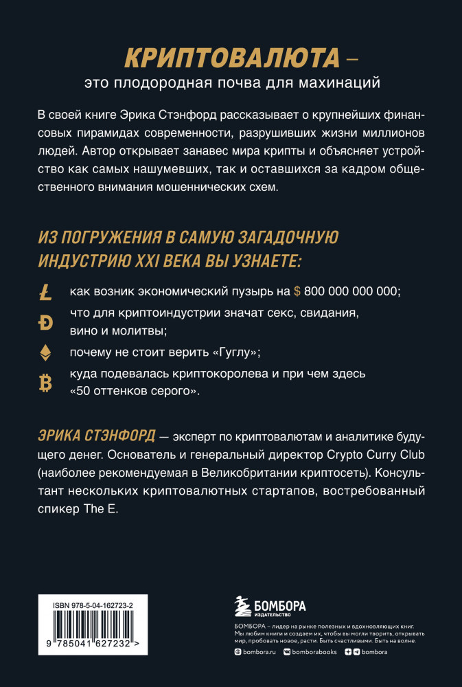 💳 Оплатить за товар можно при получении 🇰🇿 Есть бесплатная доставка по Казахстану от 1 дня 🎁 Копите бонусы с каждой покупки Серия: Top Business Awards Криптовалюта — плодородная почва для махинаций. В своей книге Эрика Стэнфорд рассказывает о крупнейших финансовых пирамидах современности, разрушивших жизни миллионов людей. Автор открывает занавес мира крипты и объясняет устройство как самых нашумевших, так и оставшихся за кадром общественного внимания мошеннических схем. |