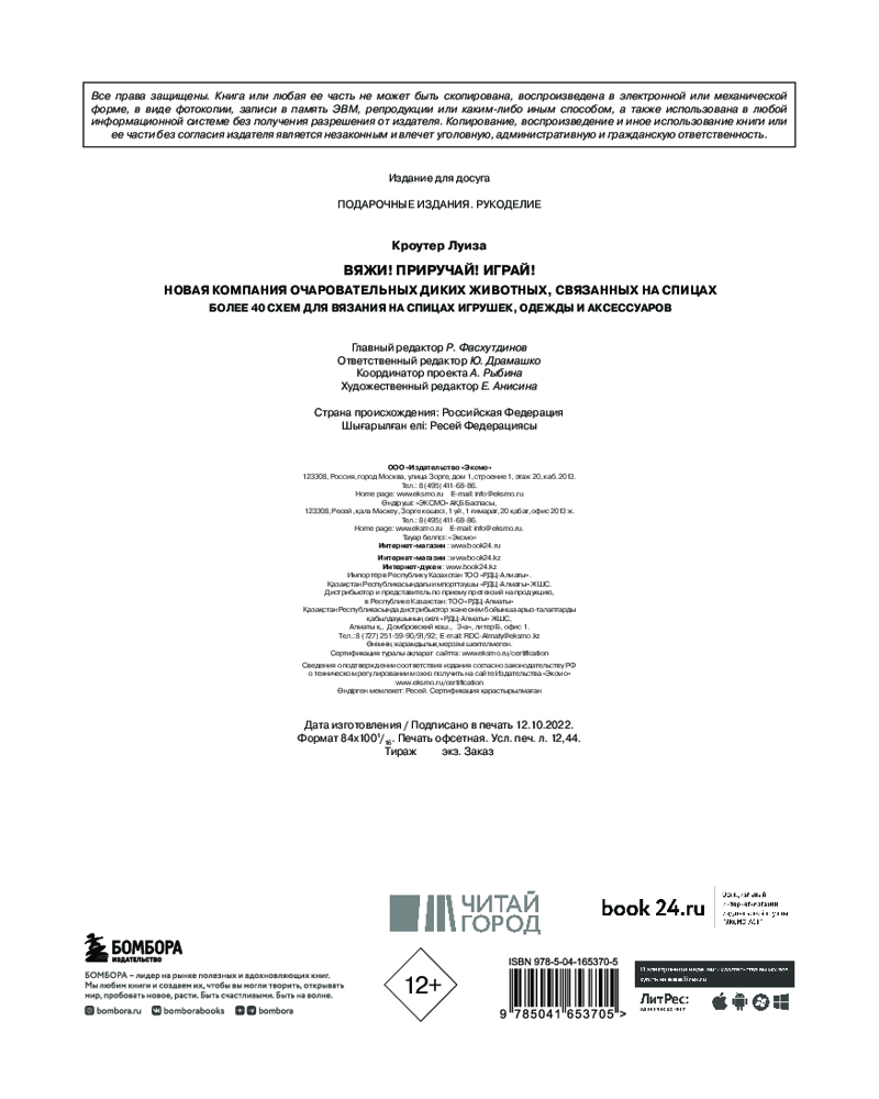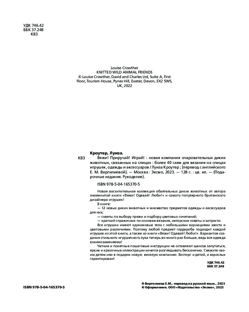 💳 Оплатить за товар можно при получении 🇰🇿 Есть бесплатная доставка по Казахстану от 1 дня 🎁 Копите бонусы с каждой покупки Серия: Подарочные издания. Рукоделие Во многих детских нашей страны и множества стран мира уже поселились очаровательные мягкие игрушки, связанные по книге Луизы Кроутер «Вяжи! Одевай! Люби!». Дети обожают играть с ними и бесконечно переодевать, составляя все новые и новые варианты образов. А все потому, что одежда из книги подходит абсолютно любой игрушке! |