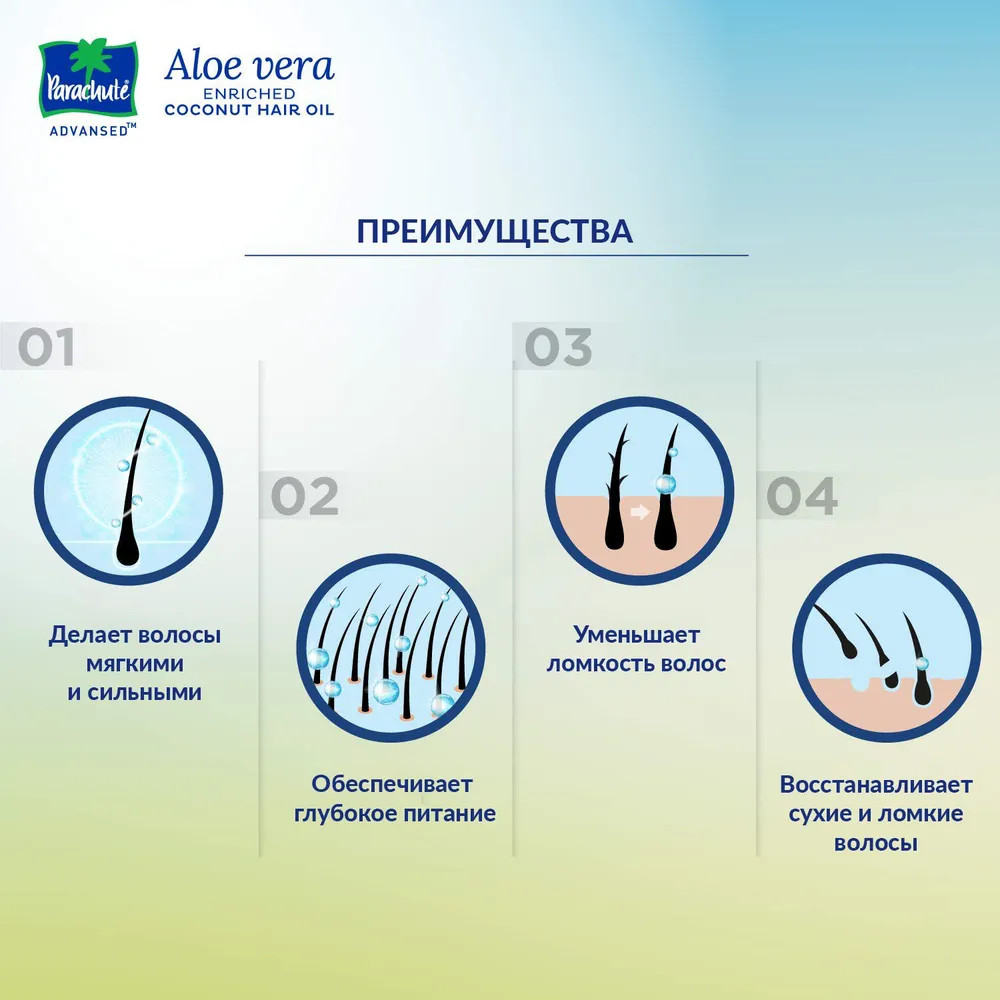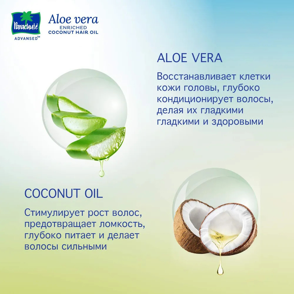 Ваши волосы станут невероятно мягкими и шелковистыми с помощью нежного масла Aloe Vera Coconut Hair Oil от экологичной марки Parachute Advanced. Продукт представляет собой комбинацию чудодейственного растения алое вера и натурального кокосового масла. Алоэ вера эффективно помогает ухаживать за волосами, делая их увлажненными, напитанными и мягкими. Благодаря уникальным кислотам, которые входят в состав кокосового масла обеспечивается глубокое питание, волосы становятся сильными и крепкими. Кокосовое масло эффективнее других масел проникает в структуру волос и оздоравливает их на молекулярном уровне. Чудодейственное сочетание экстрактов алоэ вера и кокосового масла обеспечивает долгосрочное решение проблемы непослушных, тусклых и сухих волос.