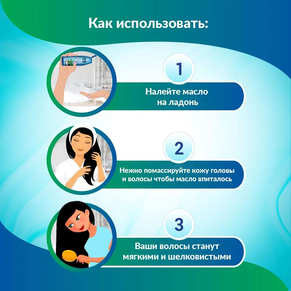 Способ применения: налейте небольшое количество масла на ладонь. Равномерно распределите масло по чистым волосам от корней до кончиков. Нежно помассируйте кожу головы и волосы, чтобы масло впиталось. Для лучшего эффекта рекомендуется наносить масло на ночь, а на утро смывать.